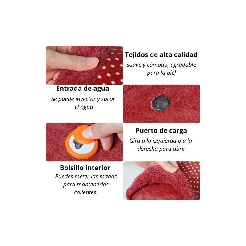 GUATERO ELÉCTRICO. - Material: terciopelo de cristal + PVC - Tamaño: aprox. 26x19cm. - Tensión nominal: 220V. - Potencia nominal: 500W. - Tiempo de uso: 4-10 horas. - La bolsa de agua caliente con patrones lindos puede calentar las manos, la cintura o el estómago. - Mantente caliente en el frío invierno. - Control automático de temperatura para evitar el sobrecalentamiento. - Seguro a prueba de exposiciones, portátil reutilizable, muy bonito. Puede poner dos manos en el. - SE ENVIA MODELO AL AZAR. Modo de uso: 1) Llene el guatero utilizando el embudo transparente, coloque el tapon. 2) Utilice de 800ml a 1 litro de agua, Colóquela tratando de no mojar el orificio de entrada. 3) Antes de encenderlo, verifique que esté seco, de no ser así, esperar a que se seque. 4) Una vez seco conectar a la toma corriente mediante el cargador negro. 5) Se encenderá la luz roja, la cual se apagará al calentar el agua. 6) Proceda a desconectarlo y así estará listo para su uso. (La publicación tiene un video que puede detallar en versión web). El paquete incluye: - 2 Unidad por bolsa de agua caliente - 2 cable de alimentación - 2 Unidad por embudo OKSHOP Garantía del vendedor: 6 meses