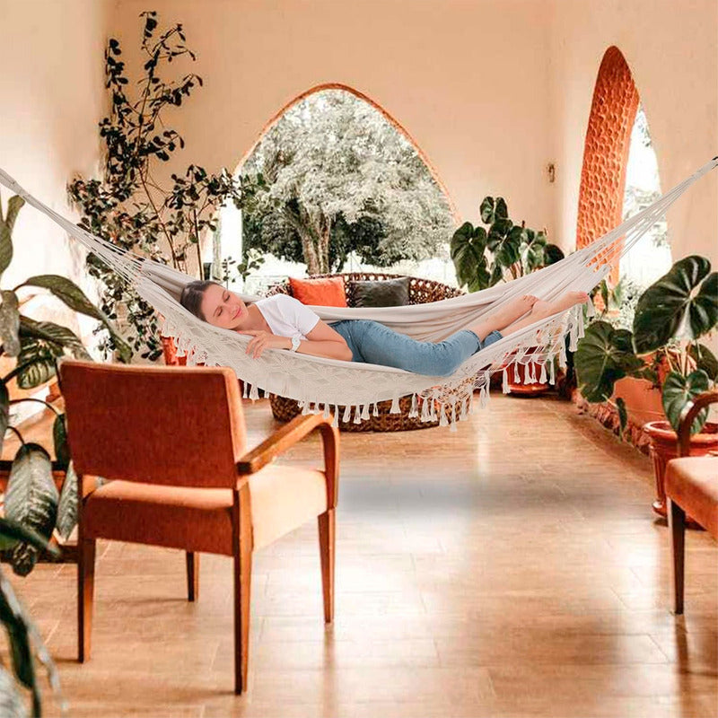 DESCRIPCION DEL PRODUCTO Esta hamaca está hecha de tela de lona de algodón/poliéster densamente tejida agradable al tacto, que es cómoda, transpirable y resistente, también duradera. El elegante diseño de borlas en ambos lados hace que la hamaca se vea excepcional. El lazo de cuerda en ambos extremos de la hamaca doble está tejido a mano con 15 cuerdas gruesas y 2 cuerdas cada grupo. La capacidad máxima de peso alcanza 100 kg, por lo que es súper segura y confiable. Proporciona suficiente espacio sin igual para dos personas mientras se adapta a la mayoría de los marcos de hamaca en el mercado. Ya sea que vayas de camping, senderismo o relajándote en el jardín, esta hamaca ligera con bolsa de transporte hará que tu embalaje sea más fácil. TAMAÑO: 250 cm x 80 cm COLOR: beige CONTENIDO DE LA COMPRA X1 Hamaca de terraza SOMOS ARCASHOPPING