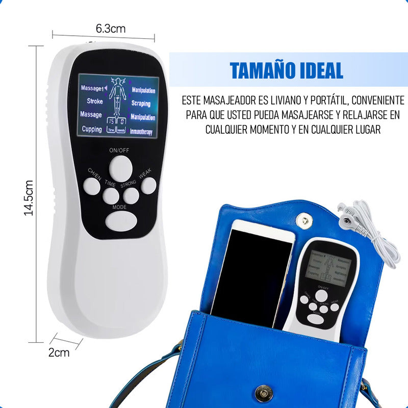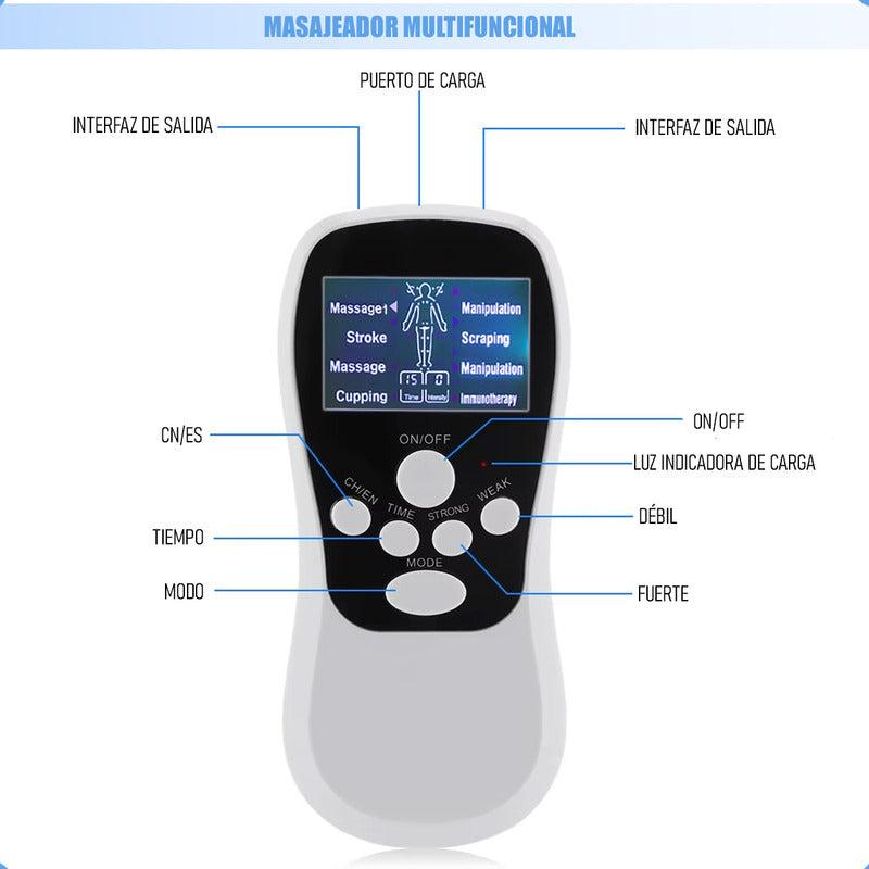 DESCRIPCION DEL PRODUCTO ELECTROESTIMULADOR PORTATIL -8 modos disponibles: Acupuntura, Trazo, Masaje, Ventosas, Manipulación, Raspado, Reducción de peso, Inmunoterapia -El masaje con micro pulsos eléctricos puede aliviar el malestar muscular, activar la vitalidad muscular, estimular los nervios y los músculos. -Adecuado para diversas partes del cuerpo como cuello, hombros, piernas, abdomen, cintura, brazos. -Intensidad 1-15 niveles, máximo hasta 15 niveles de intensidad -Temporizador 5 – 15 min, recargable -Pantalla LCD: Pantalla LCD a color única de gran tamaño, operación de pantalla más clara. -Carga a través de interfaz tipo C, con alta rentabilidad. -Tamaño pequeño portátil, peso ligero, se puede utilizar en cualquier momento y en cualquier lugar. -Dispositivo fácil de usar y fácil de usar. CONTENIDO DE LA COMPRA 1 x Electro estimulador 4 Parches SOMOS OKSHOP