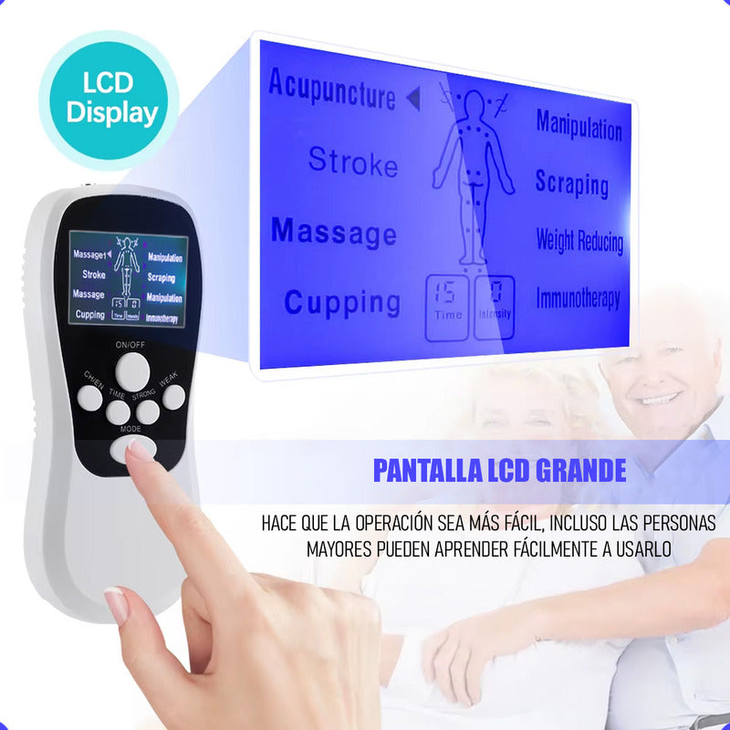 DESCRIPCION DEL PRODUCTO ELECTROESTIMULADOR PORTATIL -8 modos disponibles: Acupuntura, Trazo, Masaje, Ventosas, Manipulación, Raspado, Reducción de peso, Inmunoterapia -El masaje con micro pulsos eléctricos puede aliviar el malestar muscular, activar la vitalidad muscular, estimular los nervios y los músculos. -Adecuado para diversas partes del cuerpo como cuello, hombros, piernas, abdomen, cintura, brazos. -Intensidad 1-15 niveles, máximo hasta 15 niveles de intensidad -Temporizador 5 – 15 min, recargable -Pantalla LCD: Pantalla LCD a color única de gran tamaño, operación de pantalla más clara. -Carga a través de interfaz tipo C, con alta rentabilidad. -Tamaño pequeño portátil, peso ligero, se puede utilizar en cualquier momento y en cualquier lugar. -Dispositivo fácil de usar y fácil de usar. CONTENIDO DE LA COMPRA 1 x Electro estimulador 4 Parches 4x parches de repuesto SOMOS OKSHOP