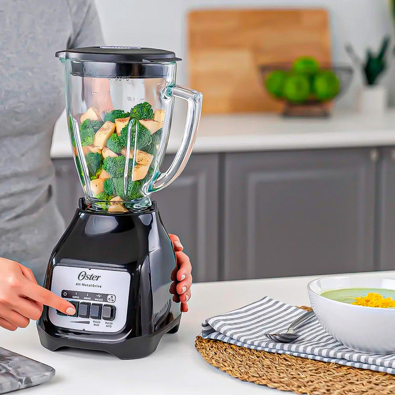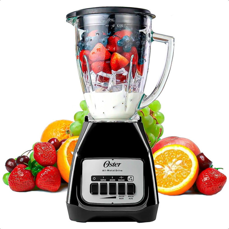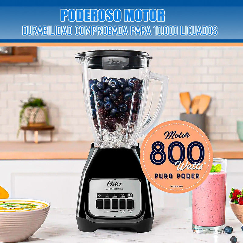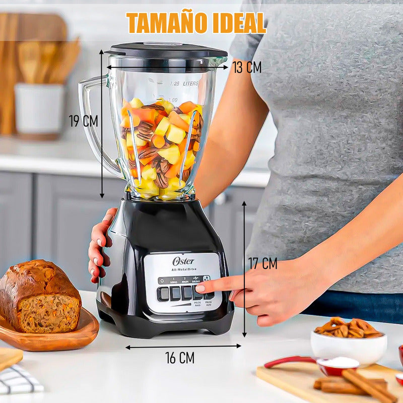 DESCRIPCION DEL PRODUCTO LICUADORA OSTER 1.5 LITROS El poderoso motor con alta fuerza de torsión y vaso de vidrio refractario Boroclass® de la licuadora Oster® son ideales para preparar una amplia variedad de recetas frías y calientes, jugos, batidos y mucho más. Motor cuatro veces más duradero* Acople metálico 10 veces más fuerte** Vaso de vidrio resistente a un choque térmico de 90°C, que te permite procesar ingredientes hirviendo sin necesidad de esperar a que estos se enfríen Dos velocidades con pulso alto y bajo Capacidad de 1.5 litros para preparar desde sopas hasta jugos, salsas y bebidas gratinadas con hielo Revolucionaria cuchilla trituradora de hielo Color: Negro Disponible en 120V y 220V *Comparado con el motor del modelo PU5443127-6115-AL en pruebas de carga**Con un nivel de resistencia a la tracción superior comparado con los acoples plásticos CONTENIDO DE LA COMPRA X1 LICUADORA OSTER 1.5 LITROS