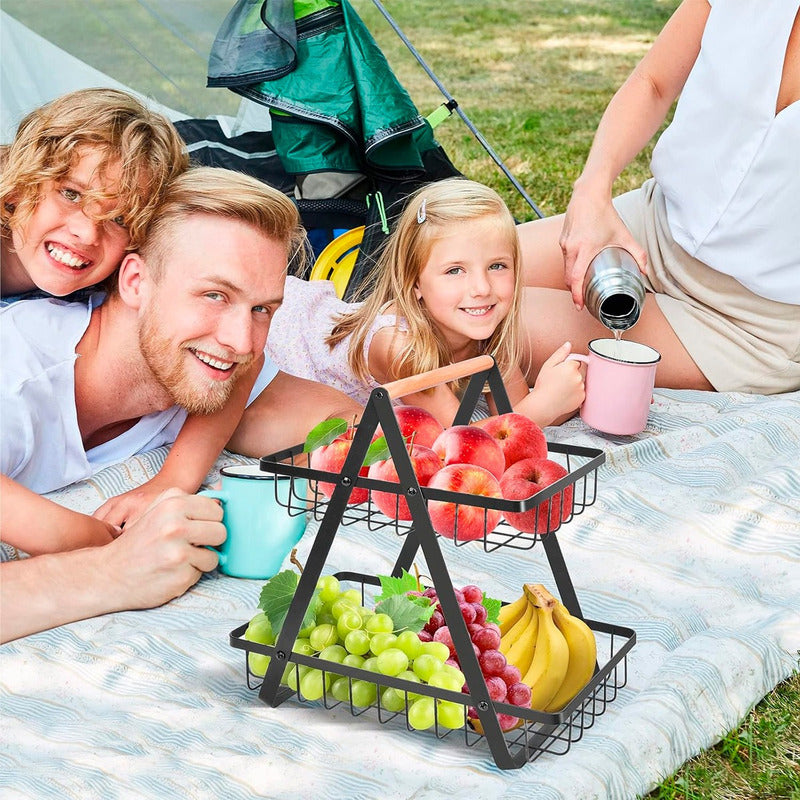 DESCRIPCION DEL PRODUCTO CANASTA DE FRUTAS DE 2 NIVELES la cesta es perfecta para guardar frutas y verduras, mantener tu espacio organizado y no ocupa demasiado espacio en la encimera. La cesta de alambre abierta permite que el aire circule más libremente, manteniendo las frutas y verduras para respirar y mantenerse frescas. Funcional y versátil, el organizador de cesta de frutas se puede colocar con frutas, verduras, cebollas, papas e incluso pequeños artículos para el hogar o suministros de oficina. Solución perfecta para almacenamiento en el hogar, se adapta a cualquier estilo y decoración. Construcción duradera, la cesta de frutas y soporte para verduras está hecha de hierro con acabado negro recubierto de polvo, resistente al óxido y al agua. Cuenta con un mango de madera fácil de transportar y todo lo que hay en la cesta se puede llevar por aquí y allá. La cesta superior es ligeramente más pequeña para darle a la canasta un efecto escalonado, lo que te permite separar frutas y verduras más fácilmente. CONTENIDO DE LA COMPRA X2 CANASTA DE FRUTAS DE 2 NIVELES