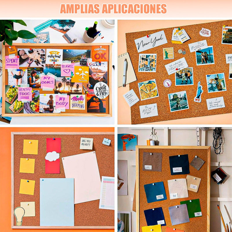 DESCRIPCION DEL PRODUCTO PIZARRA DE CORCHO Peso ligero, tablero de corcho, resistente y elegante marco de MDF de roble que protege el tablero de tachuelas mientras te proporciona un disfrute visual, ligero y duradero, garantizado que no se deforme Fuerte capacidad de autorreparación, corcho denso de alta calidad, capacidad de auto-reparación y reparabilidad, reutilizado durante mucho tiempo sin distorsión, sin agujeros antiestéticos Fácil instalación, dos formas de instalación con kits de fijación, simplemente montados vertical u horizontalmente como quieras Montado en la pared, la altura de la suspensión se decide libremente, utilizando pasadores para fijar notas, mensajes, imágenes, notas, calendarios y calcomanías, utilizado ampliamente en el hogar, la oficina y la escuela para notas, reuniones, enseñanza, etc CONTENIDO DE LA COMPRA X2 PIZARRA DE CORCHO