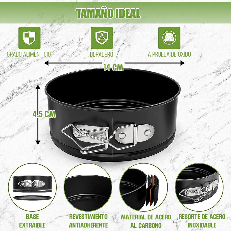 DESCRIPCION DEL PRODUCTO MOLE QUEQUE REDONDO 14CM Las sartenes de resorte bien diseñadas son opciones ideales para hacer pequeños pasteles de queso, quiches, mousse, pizzas de platos profundos, pasteles de aplastamiento, varios pasteles, galletas y también es el mejor gadget para postres de bricolaje, lo que le permite disfrutar de su tiempo de horneado Alta calidad, los moldes pequeños para tartas de queso, están hechos de material de acero al carbono de doble capa (no se oxidan). Mini moldes de resorte con revestimiento antiadherente de grado alimenticio para una fácil liberación al hornear pastel. Y los cierres de resorte están hechos de acero inoxidable sólido Parte inferior extraíble, los moldes para pasteles con forma de resorte cuentan con diseños de pestillo de resorte, que está firmemente conectado y se puede liberar fácilmente sin problemas. Los fondos desmontables pueden ayudarte a sacar los pasteles con facilidad después de hornear Fácil de usar, nuestra bandeja de resorte antiadherente permite que tus pasteles se desmoldeen fácil y completamente. Simplemente desengancha la bisagra para aflojar los lados de la bandeja elástica; levanta los lados hacia arriba y transfiere tu tarta de queso o quiche a una fuente para servir Fácil de limpiar, el revestimiento antiadherente premium puede reducir la absorción de grasa en la sartén mientras hace que la limpieza sea muy fácil. Para proteger el revestimiento antiadherente, se recomienda lavar a mano solo al limpiar los moldes redondos para tartas CONTENIDO DE LA COMPRA X4 MOLE QUEQUE REDONDO 14CM