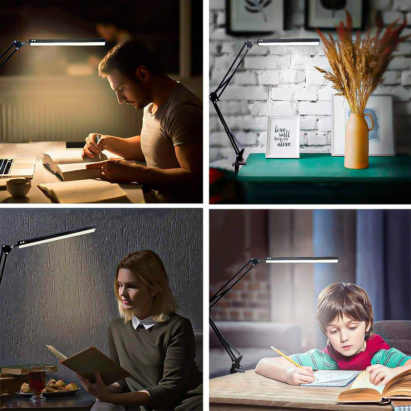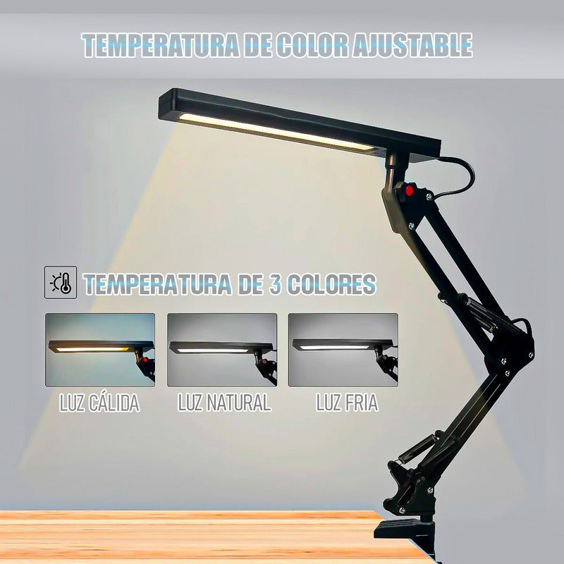 DESCRIPCION DEL PRODUCTO LAMPARA LED ESCRITORIO De diseño moderno y sencillo realizado en metal, lo que lo hace fuerte y resistente. Con brazo articulado lo que hace posible dirigir la luz hacia el punto donde se necesita. Posee TECNOLOGÍA LED INTEGRADO. Con una potencia de 5w, 560 lúmenes y TRES TEMPERATURAS de luz 3000-4000-6000K (cálido, blanco natural y blanco frío) Todo de fácil manejo desde el interruptor que posee en el cable. Es ideal para escritorios o mesas de trabajo, así como para decorar en estancias con estilos modernos y minimalistas. CONTENIDO DE LA COMPRA X1 LAMPARA LED ESCRITORIO
