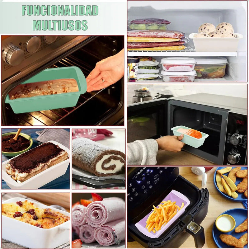 DESCRIPCION DEL PRODUCTO MOLDE DE SILICONA RECTANGULAR PARA QUEQUES Los moldes de silicona están hechos de silicona de grado alimenticio, libre de BPA, duradero y reutilizable. La temperatura resistente al calor es segura para usar en el horno, congelador, microondas y lavavajillas de manera simple y duradera, disfruta del tiempo de cocción con familiares y amigos en cualquier momento. Los utensilios de silicona para hornear son aptos para lavavajillas y fáciles de limpiar, o simplemente lavar con agua caliente y jabón. El molde para pan es flexible, fácil de almacenar e incluso se puede plegar y luego rebotar. El molde de pan de silicona se puede utilizar para panes, pastel de carne, tostadas, brownies, pasteles caseros, quiche y mucho más. Ideal para principiantes y panaderos profesionales. Satisface tus diferentes necesidades de horneado CONTENIDO DE LA COMPRA X2 MOLDE DE SILICONA RECTANGULAR
