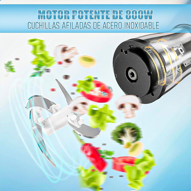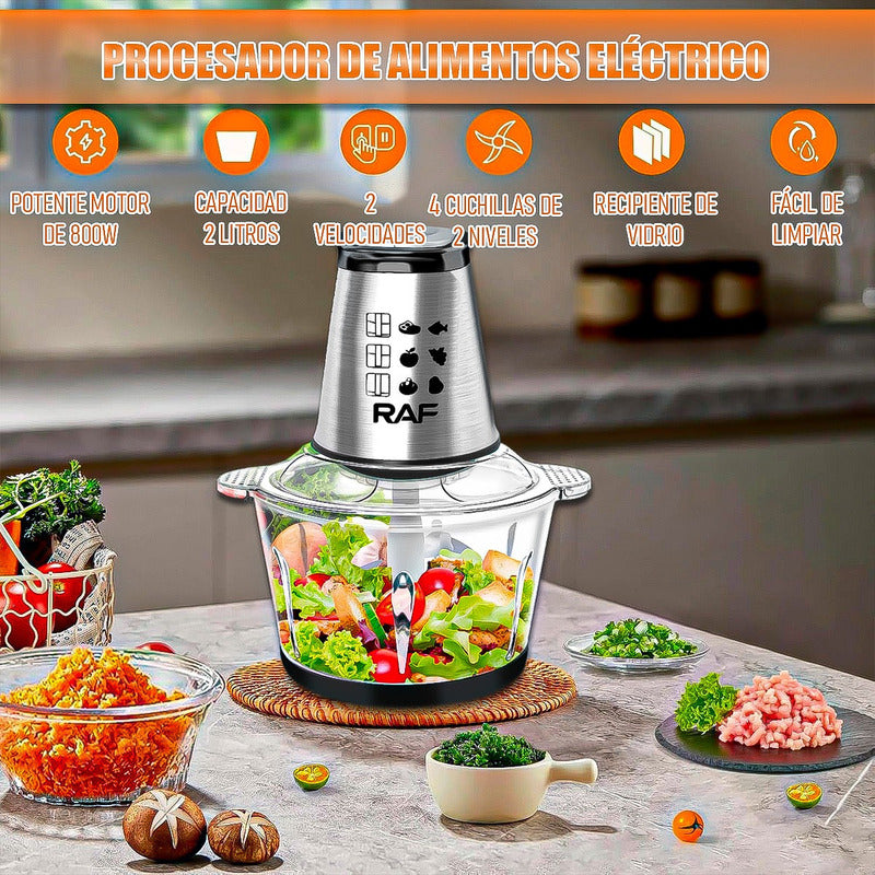 DESCRIPCION DEL PRODUCTO PROCESADOR PICADORA DE ALIMENTOS Picador multifuncional, pica verduras y vegetales, procesa carne, mezcla alimentos, gracias a su potencia de 800w es potente y muy practico para tu cocina, toma corriente de 220v que te permite utilizarlo a la corriente sin necesidad de un adaptador, hojillas de acero inoxidable para brindarte una mejor durabilidad en el tiempo. Especificaciones del Producto: - Vaso: Vidrio - Tapa superior: Plástica - Base de motor: Acero inoxidable - Potencia: 800W - Cantidad de Velocidades: 2 - Voltaje de trabajo: 220V-240V - Frecuencia: 50/60Hz - Capacidad del Vaso: 2 Litros CONTENIDO DE LA COMPRA X1 PROCESADOR PICADORA DE ALIMENTOS