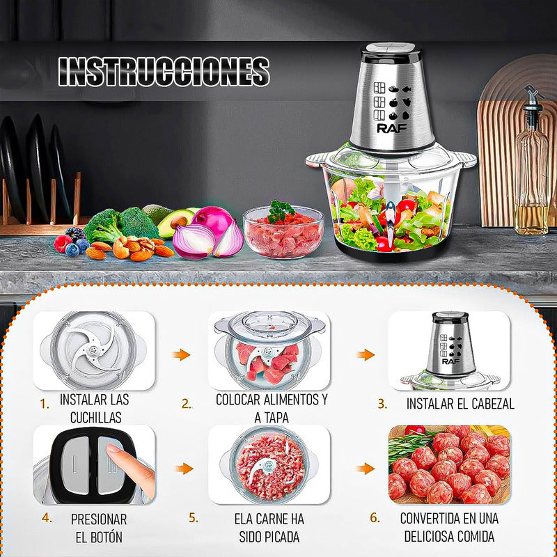 DESCRIPCION DEL PRODUCTO PROCESADOR PICADORA DE ALIMENTOS Picador multifuncional, pica verduras y vegetales, procesa carne, mezcla alimentos, gracias a su potencia de 800w es potente y muy practico para tu cocina, toma corriente de 220v que te permite utilizarlo a la corriente sin necesidad de un adaptador, hojillas de acero inoxidable para brindarte una mejor durabilidad en el tiempo. Especificaciones del Producto: - Vaso: Vidrio - Tapa superior: Plástica - Base de motor: Acero inoxidable - Potencia: 800W - Cantidad de Velocidades: 2 - Voltaje de trabajo: 220V-240V - Frecuencia: 50/60Hz - Capacidad del Vaso: 2 Litros CONTENIDO DE LA COMPRA X1 PROCESADOR PICADORA DE ALIMENTOS