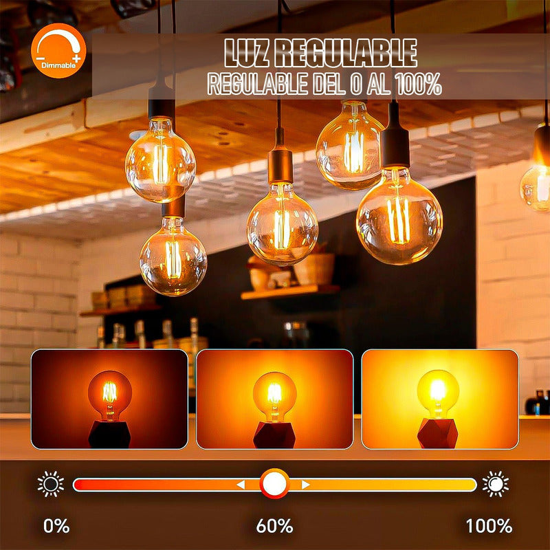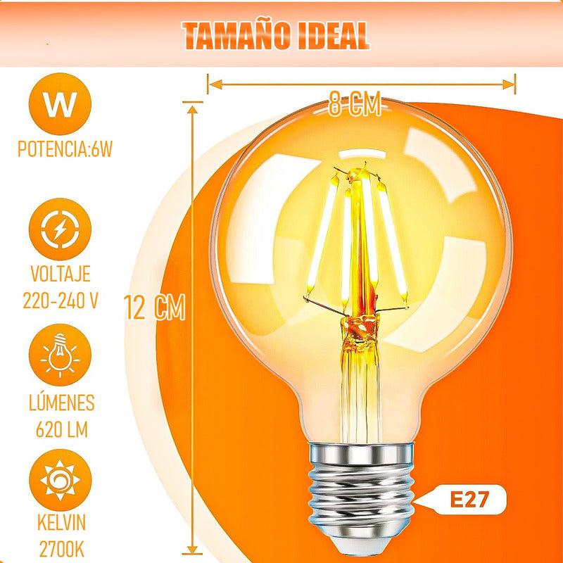 DESCRIPCION DEL PRODUCTO AMPOLLETA VINTAGE 6W Diseño clásico vintage y amplia aplicación diseñado con base en la bombilla de filamento original de Thomas Edison, el estilo retro vintage hace que esta bombilla LED también sea una hermosa luz decorativa. Estas bombillas LED son adecuadas con candelabros, ventiladores de techo, iluminación colgante, apliques, poste de lámpara, linternas o cualquier accesorio de iluminación del hogar con un enchufe de base estándar medio E26. Ampliamente utilizado en el baño, dormitorio, sala de estar, comedor, lavandería, porche o entrada. Las bombillas LED regulables G25 tienen un rango de atenuación suave del 10 al 100%. Sin zumbidos, sin tarareos, y sin parpadeos Equivalente a 60 W a 600 lm de brillo increíble, estas bombillas LED consumen solo 6 W de energía, por lo que generan mucho menos calor en comparación con otros tipos de bombillas. Protección ocular y relajación, el color blanco cálido de 2500 K es mucho más fácil para tus ojos. Ofrece un ambiente muy agradable al crear un ambiente relajante y acogedor. Una gran iluminación ambiental para salas de estar y dormitorios donde desea relajarse y descansar. Este color cálido puede suavizar el tono de la piel y reducir las imperfecciones. Se ha demostrado que el color blanco cálido también es perfecto para leer porque tiene un efecto atractivo en el papel blanco. CONTENIDO DE LA COMPRA X1 AMPOLLETA VINTAGE 6W