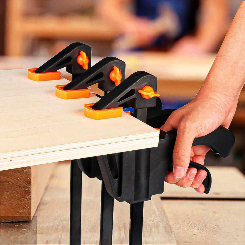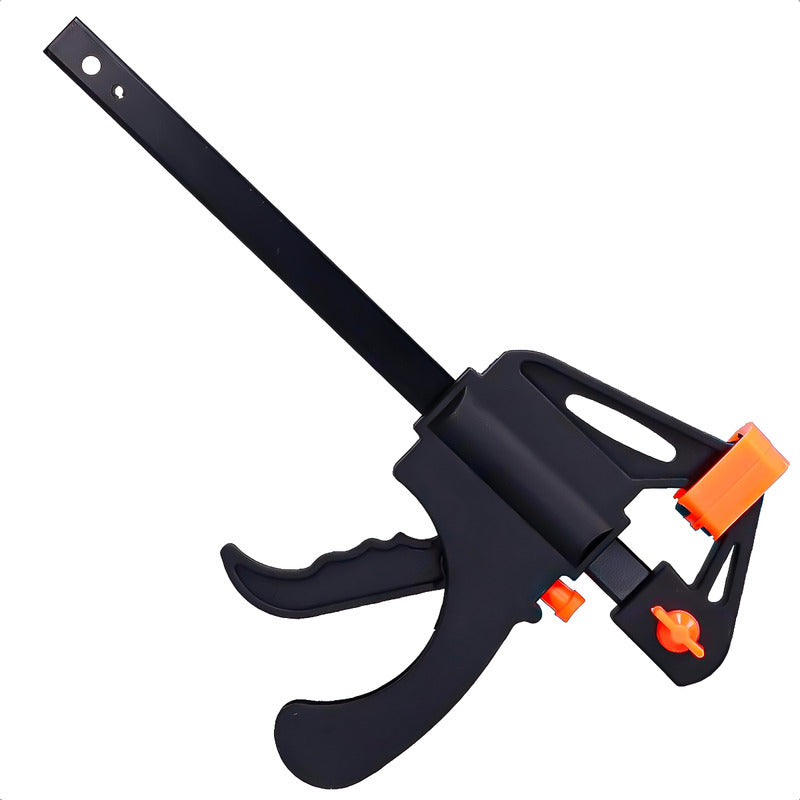 DESCRIPCION DEL PRODUCTO PRENSA ABRAZADERA DE CARPINTERIA MATERIAL DE ALTA CALIDAD, Fabricada con barra de acero de primera calidad y mango de nailon reforzado, la abrazadera es resistente y duradera, difícil de deformar o romper. Ofrece una excelente durabilidad y una larga vida útil. DISEÑO HUMANIZADO, El mango ergonómico y cómodo ofrece un tacto agradable y un buen agarre, lo que facilita su agarre y manejo. Las mordazas con almohadillas protectoras de nailon sujetan la pieza de trabajo con firmeza y estabilidad, sin rayarla ni dañarla. FÁCIL DE CAMBIAR, Las mordazas se abren o cierran con rapidez y precisión presionando el botón. El proceso de sujeción y apertura solo requiere una mano. La abrazadera de agarre rápido es fácil de colocar y controlar, manteniendo una gran fuerza de sujeción. Simplemente coloque las mordazas fijas en el otro extremo de la barra y se convertirá fácilmente de una abrazadera a un separador. USOS MULTIFUNCIONALES, La abrazadera de una mano se utiliza ampliamente en ensamblajes de carpintería, fabricación de muebles, procesamiento de metales, encolado, proyectos de bricolaje, etc. Es la mejor opción para carpinteros, metalúrgicos, ebanistas, empresas comerciales y aficionados. CONTENIDO DE LA COMPRA X1 PRENSA ABRAZADERA DE CARPINTERIA