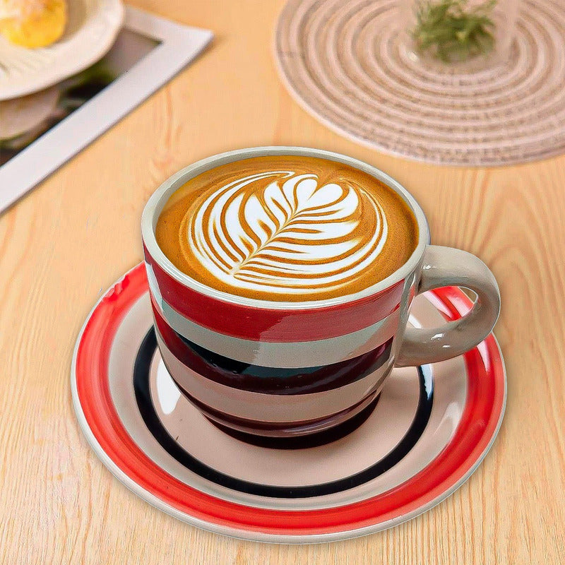 DESCRIPCION DEL PRODUCTO SET DE 6 TAZAS CON PLATOS Cerámica premium y diseño funcional: tazas de capuchino de alta calidad con platillos de cerámica aptas para lavavajillas. Ideal para capuchino, espresso, moca o té. Perfecto para baristas y amantes del café. Gran capacidad (300 ml): las tazas extra grandes permiten un desarrollo completo del aroma. El borde ancho soporta el arte del café con leche, mientras que los platillos evitan caídas y manchas. Juego de 6 piezas resistente para uso diario y anfitrión: incluye 6 tazas de café y 6 platillos a juego. Acabado duradero con pared de cerámica gruesa para una retención óptima del calor. Multiusos: se puede utilizar como tazas de capuchino, tazas de moca o juego de té. El diseño atemporal se adapta a cocinas modernas y tradicionales. Práctico y listo para regalar: transportado de forma segura en una elegante caja de regalo, ideal para bodas, inauguración de la casa o como regalo para los amantes del café. CONTENIDO DE LA COMPRA X1 SET DE 6 TAZAS CON PLATOS