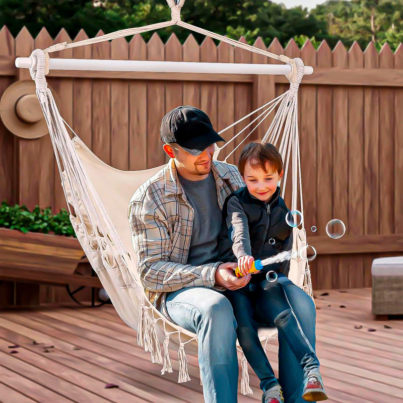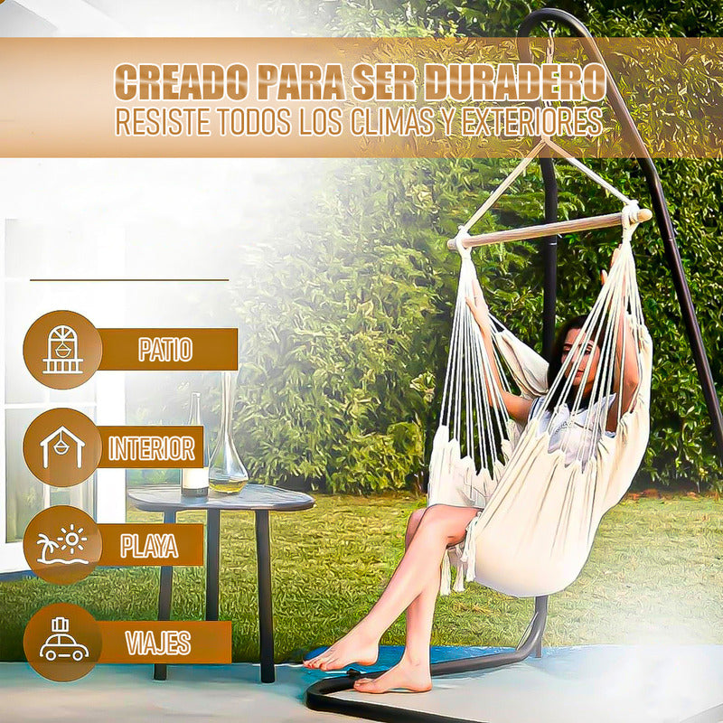 DESCRIPCION DEL PRODUCTO HAMACA COLGANTE Ideal para uso en interiores y exteriores este asiento y decoración funcional de hamaca funciona muy bien tanto en interiores como en exteriores. Puedes usarlo en tu dormitorio, patio, debajo de un árbol, en el patio, en la playa, mientras acampas y mucho más. Relájate cómodamente y disfruta de la vista: relájate mientras descansas en una hamaca columpio y contemplas el cielo nocturno con estrellas, la línea de la ciudad o las olas que chocan a la orilla. Silla colgante duradera para leer: los libros nos llevan a otro mundo. Una hamaca colgante es el mejor lugar de lectura de la casa. Juego de cojines de dos piezas para mayor apoyo: no hemos añadido uno, sino dos almohadas extra grandes para mayor comodidad y apoyo, lo suficientemente grande como para amortiguar tu posición sentada sin comer todo el espacio CONTENIDO DE LA COMPRA X1 HAMACA COLGANTE