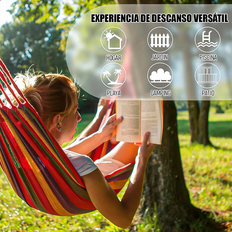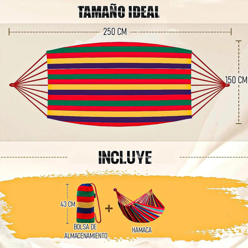 DESCRIPCION DEL PRODUCTO Esta hamaca está hecha de tela de lona de algodón/poliéster densamente tejida agradable al tacto, que es cómoda, transpirable y resistente, también duradera. El elegante diseño de borlas en ambos lados hace que la hamaca se vea excepcional. El lazo de cuerda en ambos extremos de la hamaca doble está tejido a mano con 15 cuerdas gruesas y 2 cuerdas cada grupo. La capacidad máxima de peso alcanza 450 libras, por lo que es súper segura y confiable. Proporciona suficiente espacio sin igual para dos personas mientras se adapta a la mayoría de los marcos de hamaca en el mercado. Ya sea que vayas de camping, senderismo o relajándote en el jardín, esta hamaca ligera con bolsa de transporte hará que tu embalaje sea más fácil. TAMAÑO: 250 cm x 150 cm CONTENIDO DE LA COMPRA X1 Hamaca de terraza