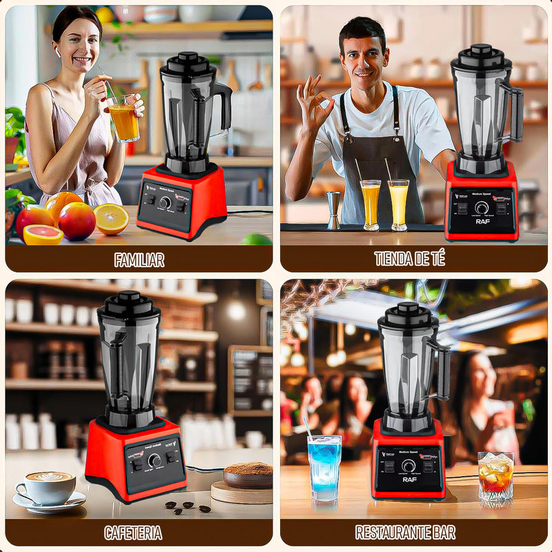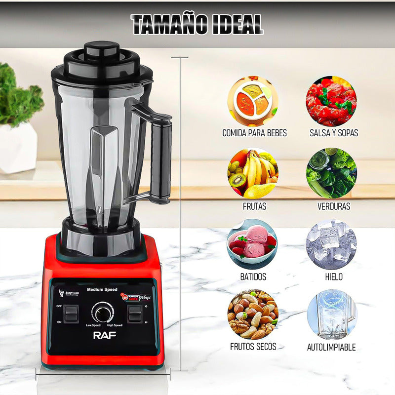 DESCRIPCION DEL PRODUCTO LICUADORA 3LITROS RAF Blender es un electrodoméstico de cocina imprescindible para todos los hogares. Es una forma segura y saludable de licuar y moler alimentos en la cocina, facilitando la limpieza. Mantenerse saludable requiere comidas balanceadas, y esta licuadora te ayuda a prepararlas de manera conveniente. Sus 8 afiladas cuchillas de acero inoxidable garantizan durabilidad, mientras que su práctico vaso dosificador permite agregar ingredientes de manera segura y fácil mientras la licuadora está funcionando. CARACTERÍSTICAS: * BPA Free. * 8 Hojas de acero inoxidable. * 8 Ajustes de velocidad más ajuste de pulso. * Fácil de limpiar. * Bloqueo automático. * Motor de cobre puro de alta velocidad. * Fácil de cortar. * Fuerte potencia. * Cabezal de corte de acero inoxidable. * Función de picado de hielo. * Protección contra sobrecalentamiento. CONTENIDO DE LA COMPRA X1 LICUADORA 3LITROS