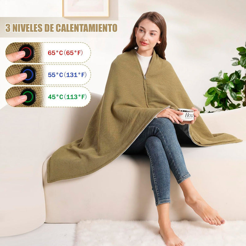 DESCRIPCION DEL PRODUCTO MANTA CALENTADORA PORTATIL Tela de lujo, hecha de una combinación de tela de punto verde y terciopelo de cristal gris ultrasuave, esta manta térmica funciona con pilas ofrece una comodidad y durabilidad excepcionales. Equipado con 8 elementos de calefacción de primera calidad, ofrece calidez relajante incluso en los días más fríos de invierno. Libertad inalámbrica, experimenta la comodidad de la verdadera portabilidad con el diseño inalámbrico de esta manta calentada por batería. Calidez instantánea y comodidad personalizada, disfruta de un calentamiento rápido en solo 3 segundos, con tres ajustes de temperatura ajustables: 113.0 °F, 131.0 °F y 149.0 °F (± 41.0 °F). Encuentra fácilmente tu nivel perfecto de calidez con solo presionar un botón. Versatilidad multiescena, ya sea que estés relajándote en casa o aventurándote al aire libre, esta manta térmica se adapta a tu estilo de vida. Ideal para acurrucarse en la cama, sofá o silla de oficina, también es perfecto para acampar, viajar o mantener el calor en tu automóvil. Diseñado para aportar calidez y comodidad CONTENIDO DE LA COMPRA X1 MANTA CALENTADORA PORTATIL