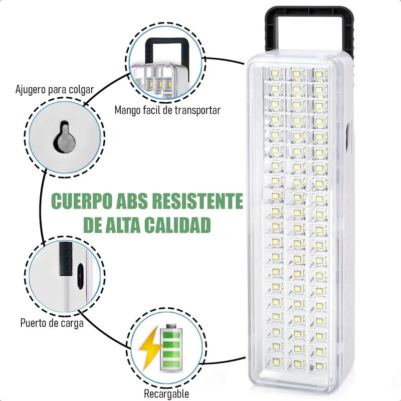 DESCRIPCION DEL PRODUCTO LAMPARA DE EMERGENCIA 60 LED Respaldo de larga duración: esta luz de emergencia cuenta con un impresionante respaldo de hasta 8-10 horas, lo que garantiza que tendrá una fuente de iluminación confiable durante cortes de energía o situaciones de emergencia. Con este tiempo de funcionamiento extendido, ofrece tranquilidad y conveniencia. Luces LED de alta intensidad: equipada con 60 luces LED de alto brillo, esta luz de emergencia proporciona una iluminación potente y uniforme, lo que la hace adecuada para una amplia gama de tareas, desde leer durante un apagón hasta trabajar en proyectos. Su diseño compacto y liviano hace que sea fácil de transportar y mover. Puede colocarlo en cualquier habitación, llevarlo en viajes de campamento o usarlo como una luz de trabajo portátil. Mango incorporado: el mango o empuñadura incorporados facilitan el transporte, la suspensión o la colocación de la luz donde la necesite. El mango es ergonómico y cómodo de sostener. Construcción duradera: Fabricada con materiales de alta calidad, esta luz de emergencia está diseñada para durar. Es resistente al desgaste, lo que garantiza que esté lista para la acción cuando la necesite. CONTENIDO DE LA COMPRA X1 LAMPARA DE EMERGENCIA 60 LED