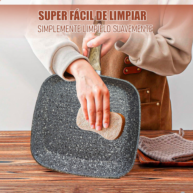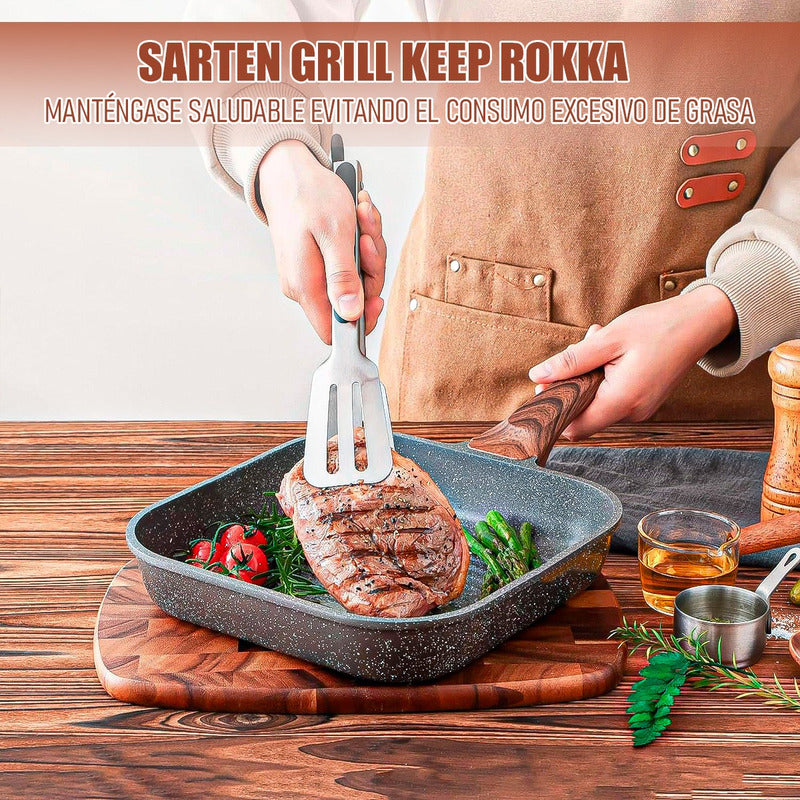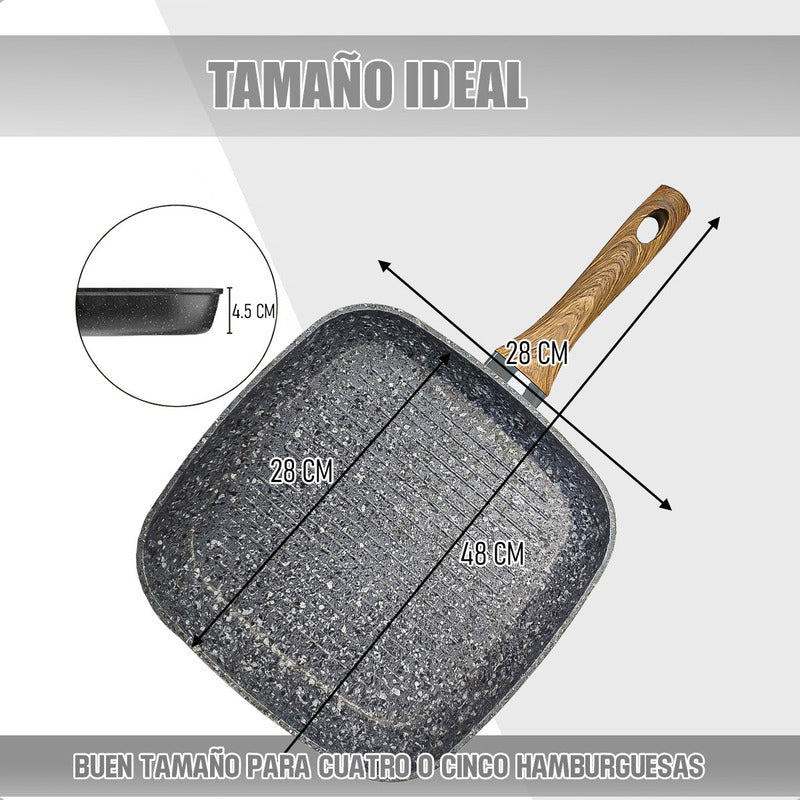 DESCRIPCION DEL PRODUCTO SARTÉN GRILL ROKKA ANTIADHERENTE. -Sartén Cuadrada Con Superficie Para Grillar de granito antiadherente reforzado de 3 Capas. -Aluminio forjado recubierto en pintura resistente al calor. Mangos y asas de silicona “Soft Touch”. -Recubrimiento interior “Ilag Marble Coating”. MATERIALIDAD: -Aluminio forjado recubierto en pintura resistente al calor, color negro -Mangos y asas de silicona “SOFT TOUCH” recubierta en textura de madera -Recubrimiento interior “ILAG MARBLE COATING” -Apto para cocinas de gas, eléctrico, inducción, cerámica. -Con textura granito -Excelente dureza superficial y una buena resistencia a los arañazos y los lavados -Espesor 4 mm. -Largo 28 cm. -Ancho 28 cm. -Largo Total 48 cm. -Alto 4,5 cm. -Peso 1,100 g. BASE GRILL: Sus ranuras grill proporciona el grillado perfecto y parejo para tus alimentos, además de un increíble antiadherente, el cual mantiene los nutrientes de tus comidas intactos ASAS SOFT TOUCH: Estos permiten un agarre seguro y cómodo, la guarda entre al asa y la base hace que este nunca se caliente CONTENIDO DE LA COMPRA X1 SARTÉN GRILL ROKKA ANTIADHERENTE.