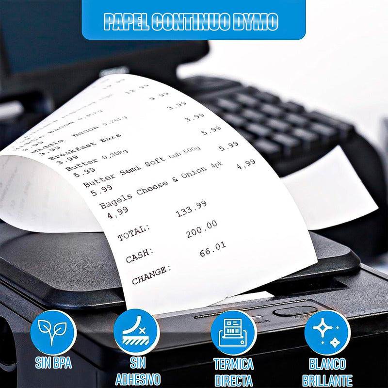 DESCRIPCION DEL PRODUCTO PAPEL CONTINUO BLANCO DYMO compatibles con papeles de recibo continuo Dymo 30270; se puede utilizar como caja registradora, papel de recibo POS, papel de tarjeta de crédito Libre de BPA, no adhesivo, térmico directo, blanco brillante Se utiliza como impresión de recibos en cajas registradoras, tiendas minoristas, taxis, supermercados, bancos, hoteles, restaurantes y oficinas. Ideal para imprimir cualquier cosa, desde listas de compras básicas hasta recibos detallados, y todos los fines generales donde se requiere un recibo o declaración para clientes, pacientes o clientes. Compatible con impresoras Dymo LabelWriter, CoStar LabelWriters, Rollo y más impresoras térmicas de etiquetas. Nota: no es compatible con impresoras de etiquetas Dymo 550, 550 Turbo, 5XL CONTENIDO DE LA COMPRA X1 PAPEL CONTINUO BLANCO DYMO