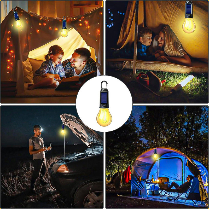DESCRIPCION DEL PRODUCTO AMPOLLETA SOLAR RECARGABLE Materiales de alta calidad, Cada lámpara de camping está fabricada con material ABS de alta calidad, seguro y fiable, que ofrece máxima durabilidad y resistencia al agua, además de un uso seguro en exteriores, dondequiera que esté. Nuestra lámpara de camping cuenta con 3 modos de luz diferentes, luz intensa, luz media y luz tenue. Esta luz para tienda de campaña equivale a una bombilla LED de 15 W y proporciona suficiente iluminación, ya sea que necesites una luz ambiental suave o una luz intensa. Carga tipo C, Esta linterna de camping cuenta con una batería recargable integrada que se carga completamente en tan solo 3 horas. Gracias a la función de carga, podrás recuperar la luminosidad rápidamente. Lámpara de camping resistente e impermeable, Fabricada en plástico ABS resistente, el puerto USB se encuentra sobre el interruptor de encendido y está protegido con goma. Además, cuenta con un gancho para colgarla en tiendas de campaña, mochilas, árboles, coches, vehículos o cualquier otro lugar donde se puedan colgar objetos ligeros. Amplia gama de aplicaciones, con nuestras luces de camping, podrá disfrutar de momentos inolvidables con su familia y amigos, descansar y disfrutar de otras actividades en interiores y exteriores. Esta versátil luz para tienda de campaña es ideal para camping, senderismo, excursionismo o emergencias, y proporciona una iluminación fiable. CONTENIDO DE LA COMPRA X2 AMPOLLETA SOLAR RECARGABLE