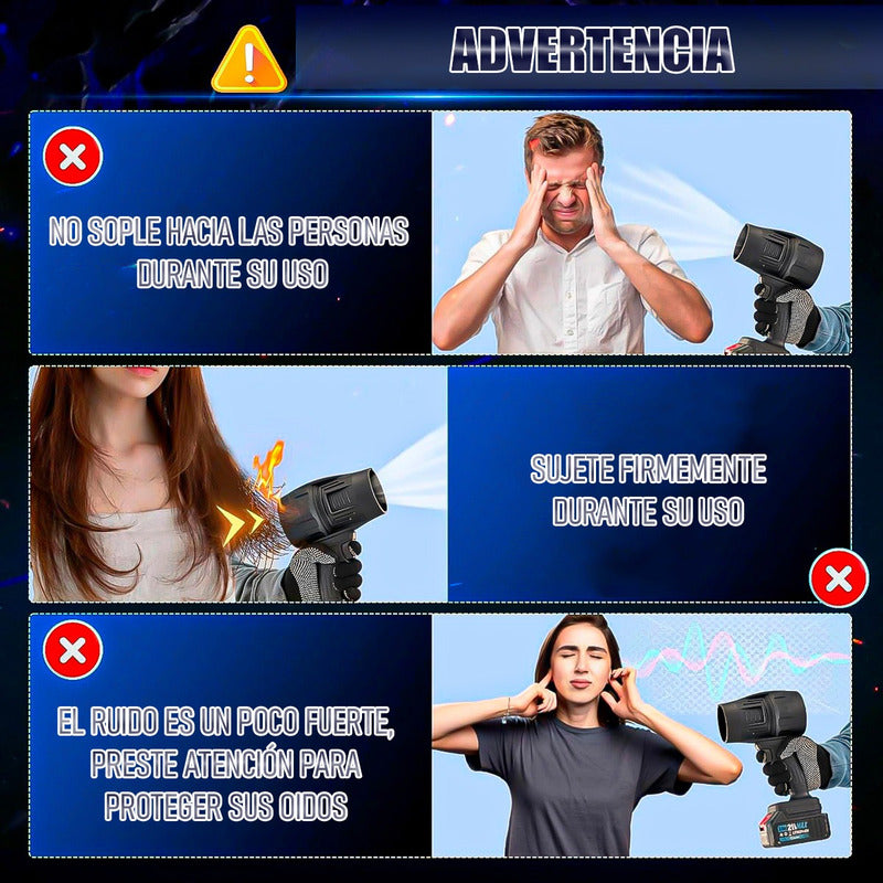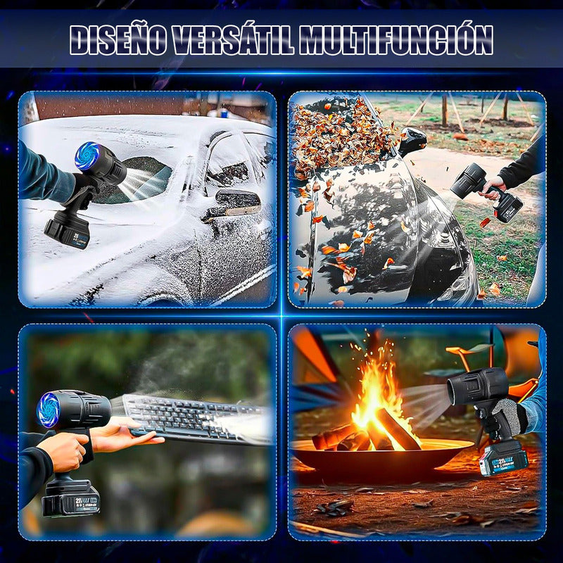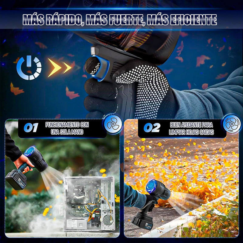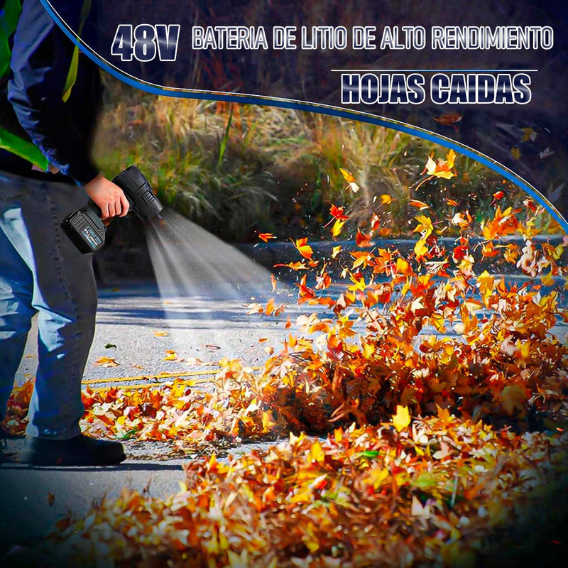 DESCRIPCION DEL PRODUCTO SOPLADOR PROFESIONAL DE POLVO Motor turbo de alto rendimiento: equipado con tecnología Turbo avanzada, este soplador de hojas inalámbrico genera una velocidad de viento de hasta 180,000 RPM y 120 MPH. Su motor de alta capacidad y sus grandes palas de turbofán garantizan un flujo de aire superior Diseño versátil multifunción, más allá del soplado de hojas, este soplador es perfecto para una variedad de tareas de limpieza, incluyendo secar autos, limpiar entradas de vehículos, quitar el polvo de espacios difíciles de alcanzar e incluso mejorar el flujo de aire para incendios de barbacoa. Su diseño compacto e inalámbrico lo convierte en una herramienta de limpieza imprescindible Batería de 48 V de larga duración, alimentada por una batería recargable de alta capacidad Ligero y portátil, cuenta con un agarre ergonómico para un manejo sin fatiga, incluso durante un uso prolongado. Su tamaño compacto y su estuche de almacenamiento incluido hacen que sea fácil de transportar y almacenar, perfecto para limpieza sobre la marcha o tareas rápidas al aire libre CONTENIDO DE LA COMPRA X1 SOPLADOR PROFESIONAL DE POLVO