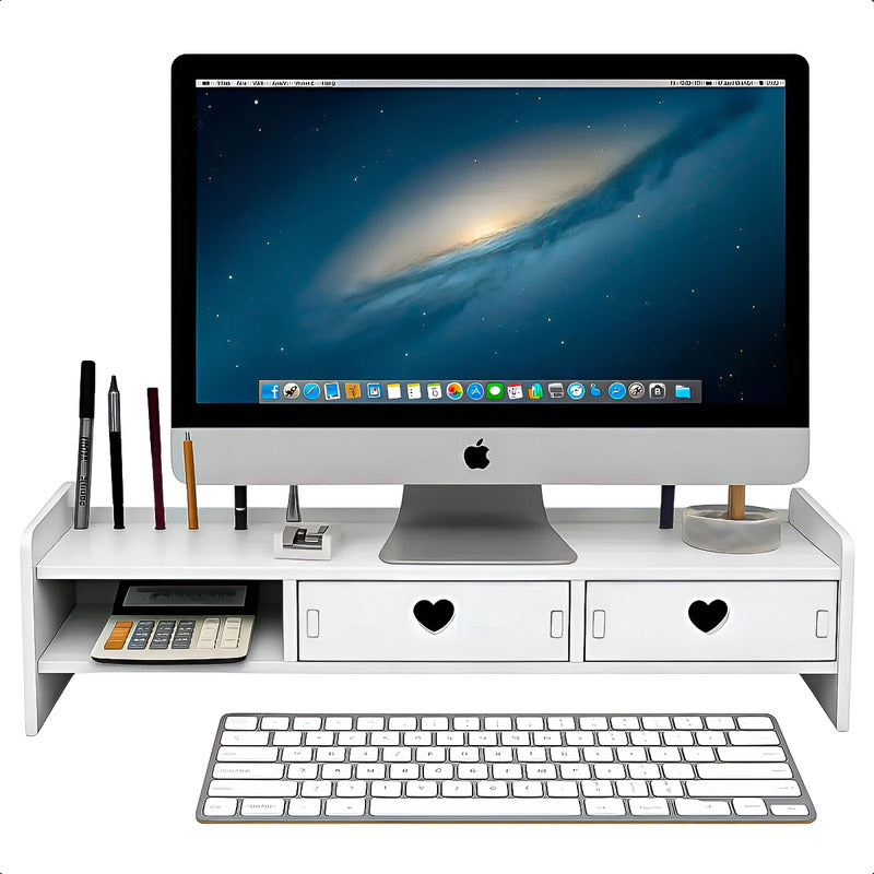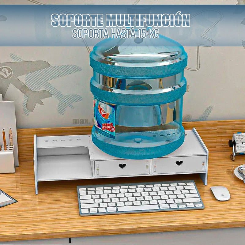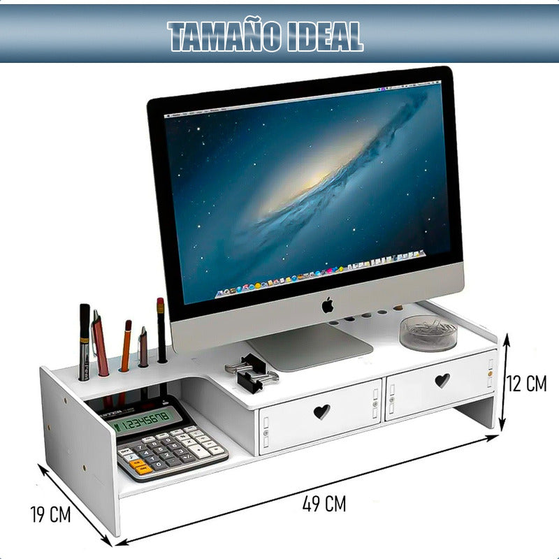 DESCRIPCION DEL PRODUCTO Soporte Elevador Para PC Este bonito soporte multifunción para monitor es suficientemente fuerte para soportar tu monitor y tiene suficiente espacio para el mouse, teclado, etc. Tambien puedes almacenar lápices y otras cosas en cajones. Hecho de materiales de alta calidad y aumenta el espacio del escritorio y acomoda objetos pequeños como ratones, teclados y teléfonos móviles. Simple, elegante, mantiene el escritorio limpio y ordenado. Este soporte para monitor se puede utilizar como un elevador de soporte para monitor, soporte de impresora, soporte de computadora, soporte para laptop, soporte de TV o incluso soporte de escritorio. - Material: MDF - Color: Blanco - 2 Cajones - Medidas: 49 x 19 x 12 cm - Ligero, duradero y practico - Multifuncional CONTENIDO DE LA COMPRA 1 x Soporte Organizador Para PC 1 x Destornillador 1 x Paquete de tornillos 1 x Manual de usuario