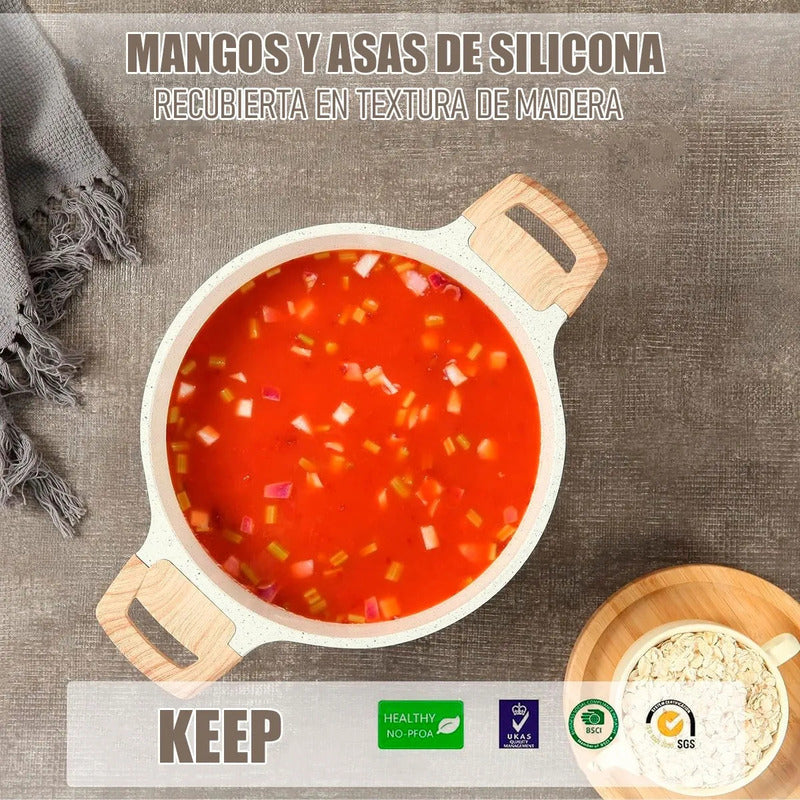DESCRIPCION DEL PRODUCTO BATERÍA DE COCINA KEEP 8 PIEZAS De excelente dureza superficial y una buena resistencia a los arañazos y a los lavados. Ultra resistente, Ultra saludable, Ultra fácil de limpiar. El antiadherente perfecto para exigencias elevadas, pintura antiadherente ILAG Basic es un revestimiento antiadherente de varias capas, con excelentes propiedades antiadherentes y una alta resistencia al desgaste para el uso doméstico intensivo. Excelente dureza superficial y una buena resistencia a los arañazos y los lavados. CUERPO FUNDIDO: Distribuye uniforme el calor, mayor resistencia a la corrosión y rayado, mayor ahorro de energía. ASAS Y MANILLAS SOFT TOUCH: Estos permiten un agarre seguro y cómodo. La guarda entre el asa y la base hace que los mangos no se calienten. ANTIADHERENTE PREMIUM: "ILAG" es un antiadherente de origen suizo que proporciona el cuidado adecuado para los nutrientes de tus comidas, además de una fácil y rápida limpieza. 1 Olla de 36 cm con tapa 1 Olla de 32 cm con tapa 1 Sarten 44cm 1 Cucharon 32 cm 1 Espátula 32 cm 1 Pinza 34 cm CONTENIDO DE LA COMPRA 2 Olla 1 Sarten 1 Cucharon 1 Espátula 1 Pinza 2Tapas de vidrio