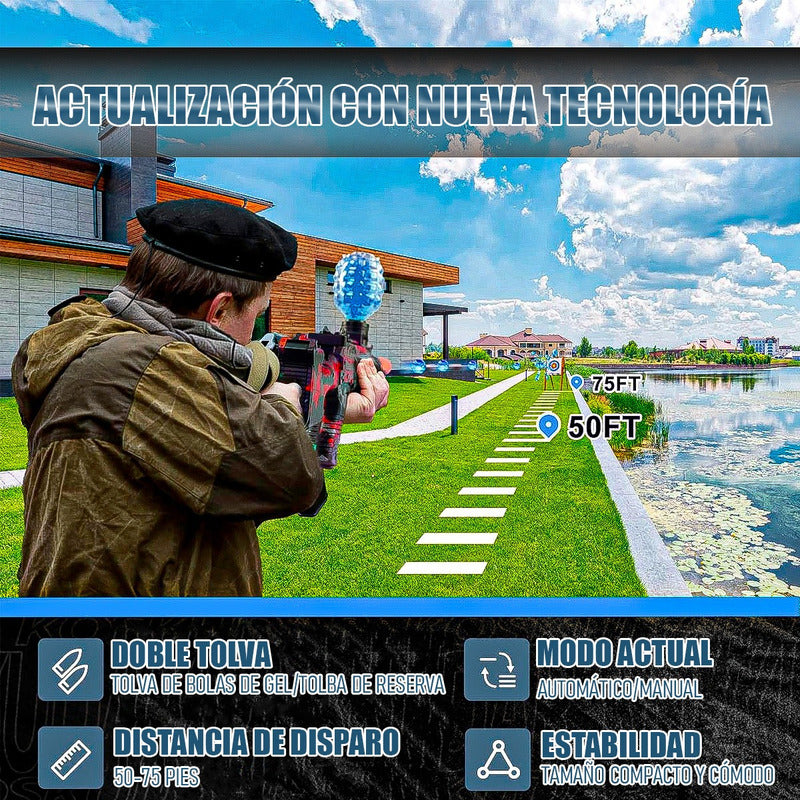 DESCRIPCION DEL PRODUCTO La mejor opción para juegos al aire libre Perfecto para niños y niñas a partir de 12 años. Adecuado para patio trasero, jungla, colina y terreno plano. Este es un regalo de fiesta ideal. Los diferentes diseños hacen que la pistola sea realmente llamativa. Al disparar, el lanzador de gel produce efectos de sonido geniales que hacen que la experiencia de juego sea aún más intensa. las armas son aptas para un jugador y para varios jugadores, tanto en interiores como en exteriores. Además, las bolas de gel están libres de sustancias nocivas para el medio ambiente. Puede proporcionar una larga duración de la batería continua y estable para tu batalla. El lanzador de bolas de gel funciona con una batería de 7.4 V y 600 mAh. Solo necesita cargar 3 ~ 4 horas El lanzador de bolas de gel de alto rendimiento tiene un alcance muy largo, hasta 80 a 100 pies. MATERIAL: ABS DE ALTA RESISTENCIA CONTENIDO DE LA COMPRA X2 Pistola hidrogel X2 bolsa de balines de hidrogel X2 batería X2 depósito de balines