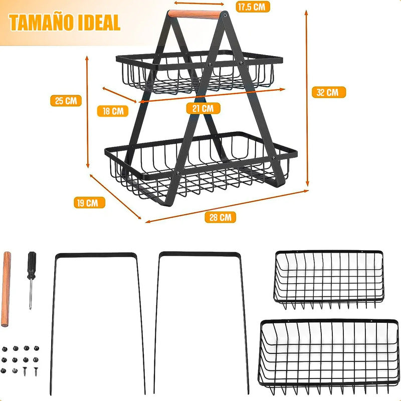 DESCRIPCION DEL PRODUCTO CANASTA DE FRUTAS DE 2 NIVELES la cesta es perfecta para guardar frutas y verduras, mantener tu espacio organizado y no ocupa demasiado espacio en la encimera. La cesta de alambre abierta permite que el aire circule más libremente, manteniendo las frutas y verduras para respirar y mantenerse frescas. Funcional y versátil, el organizador de cesta de frutas se puede colocar con frutas, verduras, cebollas, papas e incluso pequeños artículos para el hogar o suministros de oficina. Solución perfecta para almacenamiento en el hogar, se adapta a cualquier estilo y decoración. Construcción duradera, la cesta de frutas y soporte para verduras está hecha de hierro con acabado negro recubierto de polvo, resistente al óxido y al agua. Cuenta con un mango de madera fácil de transportar y todo lo que hay en la cesta se puede llevar por aquí y allá. La cesta superior es ligeramente más pequeña para darle a la canasta un efecto escalonado, lo que te permite separar frutas y verduras más fácilmente. CONTENIDO DE LA COMPRA X1 CANASTA DE FRUTAS DE 2 NIVELES