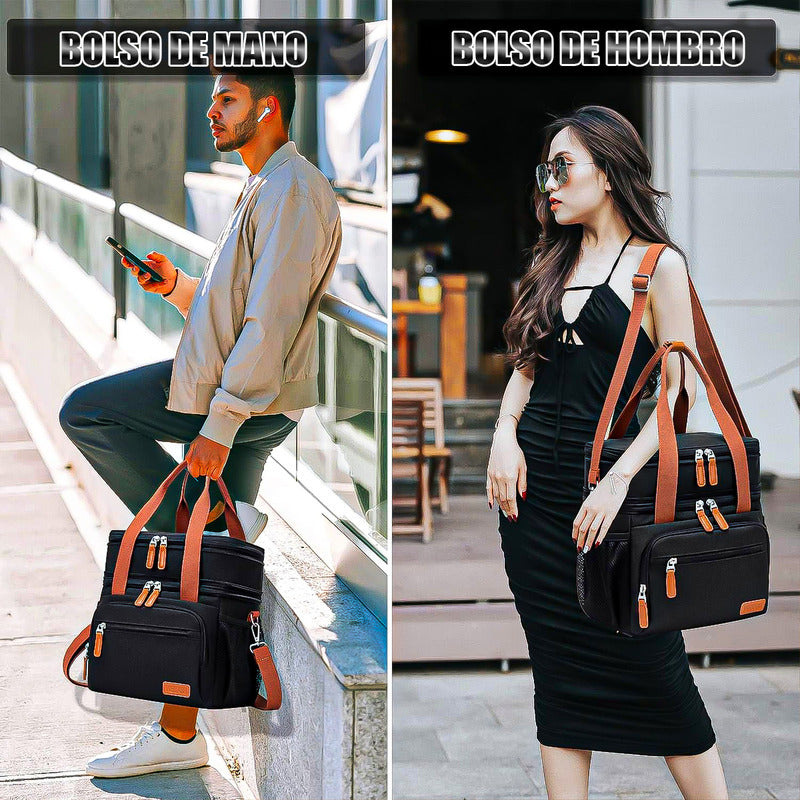 DESCRIPCION DEL PRODUCTO LONCHERA PORTATIL DE GRAN CAPACIDAD La lonchera de doble cubierta cuenta con dos compartimentos separados con una gran capacidad de 14 litros. lo que le permite almacenar diferentes tipos de alimentos en una bolsa compacta y portátil. El compartimento superior es espacioso y aislado, proporcionando un excelente control de temperatura para mantener tu plato principal, sándwiches, frutas o ensaladas perfectamente fríos o calientes hasta la hora del almuerzo. Excelente aislamiento térmico: la lonchera reutilizable está diseñada con aislamiento de tres capas. La capa exterior es de tela Oxford 300D duradera y fibra de poliéster, la capa interior es de material EVA respetuoso con el medio ambiente, y la capa intermedia está especialmente rellena con espuma de perlas aislantes de 0.197 in de grosor. Fácil de transportar: llevar tu almuerzo nunca ha sido más fácil o más cómodo. La lonchera de doble cubierta cuenta con un asa resistente y una correa de hombro ajustable y desmontable, lo que te da la flexibilidad para llevarla de la manera que más te convenga. Diseño precioso: la lonchera de doble compartimento con detalles de diseño reflexivos, esta lonchera ofrece la máxima funcionalidad. La cremallera doble de metal reforzado de alta calidad puede garantizar una apertura suave, diseño de boca ancha para depósito y extracción. El cierre de doble cremallera permite un fácil acceso a cualquier compartimento, mientras que las costuras reforzadas garantizan una larga durabilidad. Amplia aplicación: ya sea que vayas a la oficina, un picnic o cualquier aventura sobre la marcha, la lonchera de doble cubierta es tu compañera confiable para mantener tus comidas frescas y organizadas. CONTENIDO DE LA COMPRA X1 LONCHERA PORTATIL DE GRAN CAPACIDAD