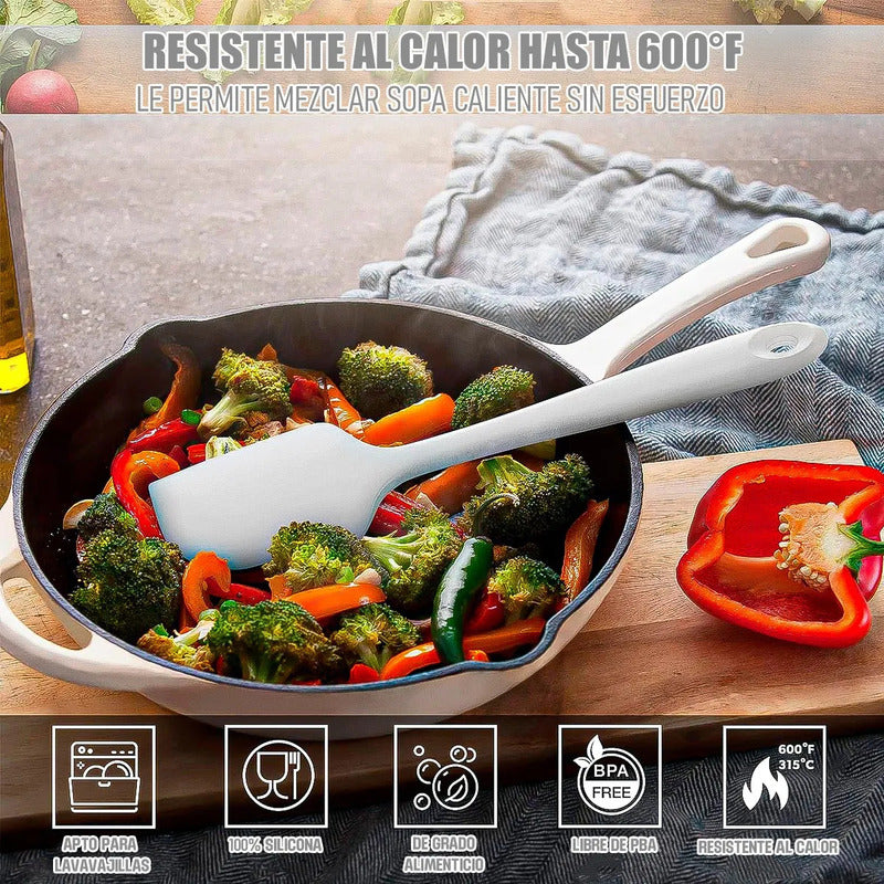 DESCRIPCION DEL PRODUCTO ESPATULA SILICONA Nuestro utensilio de cocina de silicona resistente al calor de alta calidad tiene un núcleo de acero inoxidable en el interior para mayor resistencia. La espátula de silicona resistente al calor puede soportar el uso exigente de cocinar, hornear y mezclar. Cómodo de manejar y agarre antideslizante, perfecto para agitar, raspar y plegar una amplia variedad de alimentos y sin costuras ni grietas para atrapar alimentos. Tenemos las espátulas de silicona especialmente diseñadas para ti. La mini silicona suave es el equilibrio perfecto entre fuerza y flexibilidad, el borde liso te permite raspar fácilmente los lados de tu tazón de mezcla o glaseado en tu pastel para glasear, y tiene una cabeza de silicona resistente y un diseño profesional de radianes que funcionan muy bien para mezclar masa y hornear. La espátula de silicona antiadherente resistente al calor se puede limpiar de la misma manera que los utensilios de cocina normales, resisten las manchas y la espátula de silicona flexible antiadherente apta para lavavajillas no se deforma, derrite o astilla en el lavavajillas, espátula de silicona antiadherente sin BPA para utensilios de cocina antiadherentes. A diferencia de otras espátulas baratas de bajo rendimiento, nuestra espátula de silicona grande es perfecta para agitar, raspar y plegar una amplia variedad de alimentos. Nuestro innovador diseño sin costuras no tiene costuras ni grietas para atrapar alimentos y mugre, lo que significa que tu espátula grande se limpiará fácilmente y mantendrá tu comida segura. CONTENIDO DE LA COMPRA X4 ESPATULA SILICONA