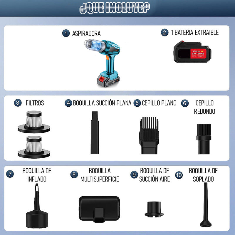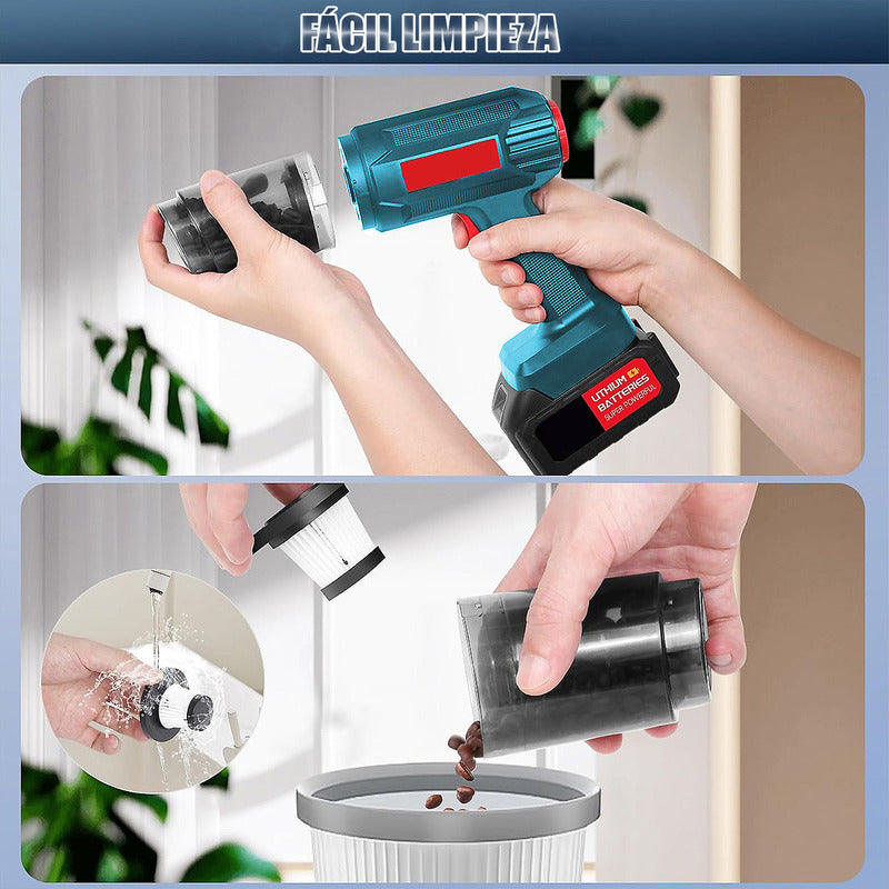 DESCRIPCION DEL PRODUCTO ASPIRADORA INALAMBRICA La aspiradora cuenta con un filtro HEPA mejorado con una envoltura de filtro diseñada para prolongar la vida útil del filtro y evitar obstrucciones mientras garantiza una fuerte succión. La aspiradora de mano está equipada con cuatro funciones: succión, soplado, inflado y aspirado. Fuerte potencia de succión para cada centímetro de espacio. La aspiradora está equipada con un potente motor de 120 W que proporciona, resuelve fácilmente los desafíos que enfrentas. Esta aspiradora inalámbrica viene con 6 tipos de accesorios para boquillas de cabezal de cepillo desmontables. La boquilla de soplado, la boquilla de succión y la boquilla del cepillo para soplar y aspirar diariamente La aspiradora tiene un diseño elegante, esta aspiradora de mano cuenta con un diseño portátil, por lo que es muy funcional y es cómoda de sostener y ahorra espacio, por lo que es fácil de transportar y almacenar, lo que te permite moverla rápidamente de una habitación a otra. CONTENIDO DE LA COMPRA X1 ASPIRADORA INALAMBRICA