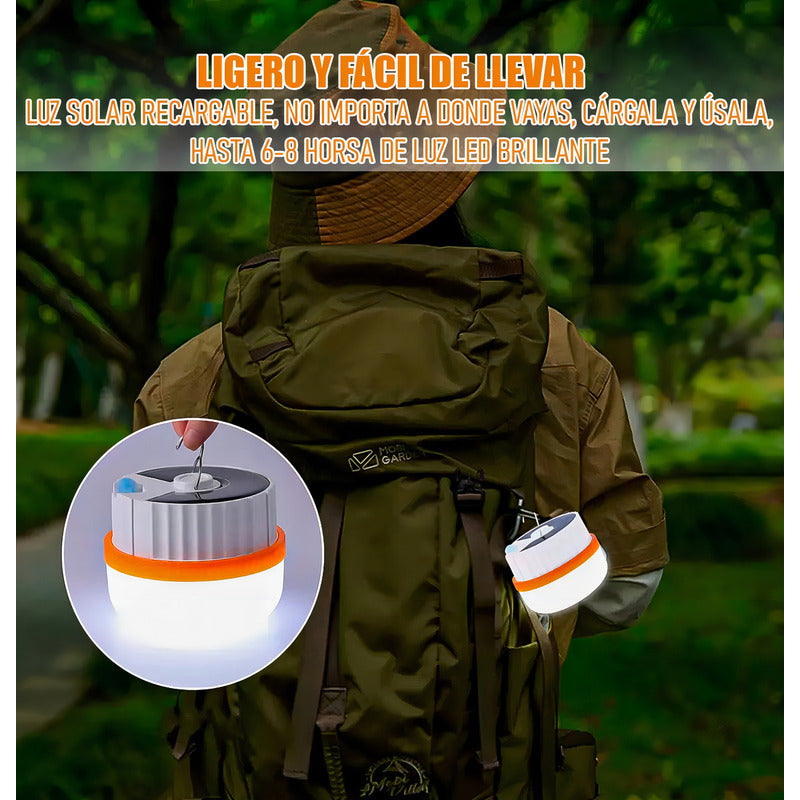 DESCRIPCION DEL PRODUCTO LAMPARA CAMPING RECARGABLE Color claro: Blanco Material del producto: ABS+PC Número de cuentas de lámpara: 42LEDs Tamaño: 10*10*7,5cm Modo de luz: Luz fuerte/Luz media/Luz baja Modo de conmutación: interruptor de llave Capacidad de la batería: 2400 mAh (batería de litio) Tiempo de carga: 5-6h Duración: 6-8 horas Método de carga: Carga solar / Carga por puerto USB Modo de suspensión: Ganchos e imanes Grado de impermeabilidad: IP65 Lumen: 360LM Potencia: 150W Temperatura de color: 6500k Batería recargable de 2400mAh incorporada que se puede cargar mediante energía solar o USB y dura aproximadamente 6-8 horas de iluminación continua con una carga completa. Esta linterna solar de emergencia es ligera pero brillante. Los tres ajustes de brillo, luz fuerte, media y baja, pueden satisfacer las necesidades de todo tipo de ocasiones. Hecho de material ABS de alta calidad - IP65 impermeable, a prueba de golpes, a prueba de rayos, a prueba de luz solar, puede soportar condiciones climáticas adversas y dura más de 50.000 horas. La base tiene 1 imán que se fija a cualquier superficie metálica, como una bicicleta, un coche o el poste de una tienda de campaña. También se puede colgar con el gancho incluido CONTENIDO DE LA COMPRA X1 LAMPARA CAMPING RECARGABLE