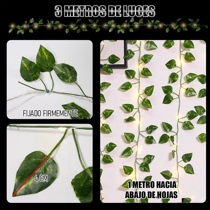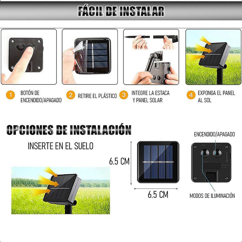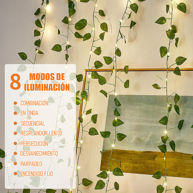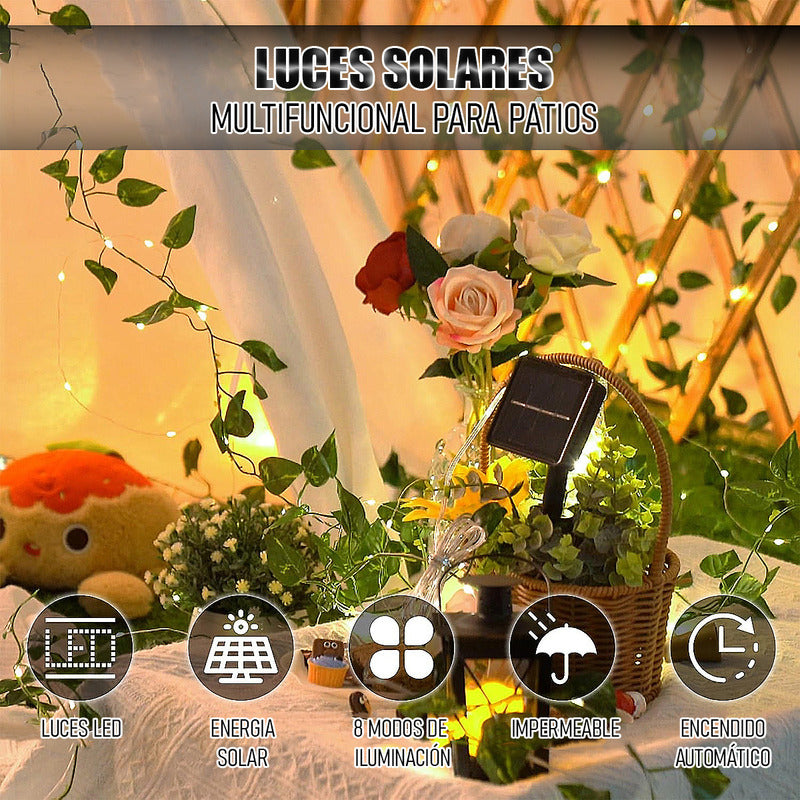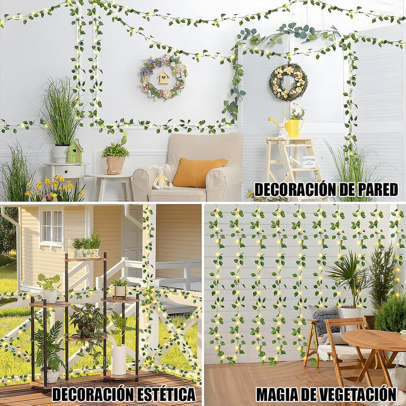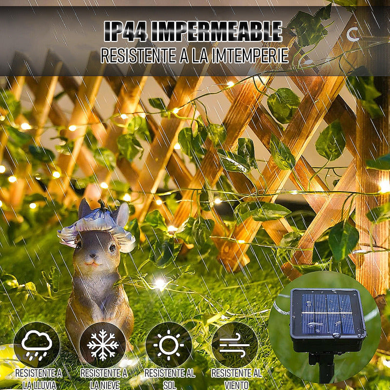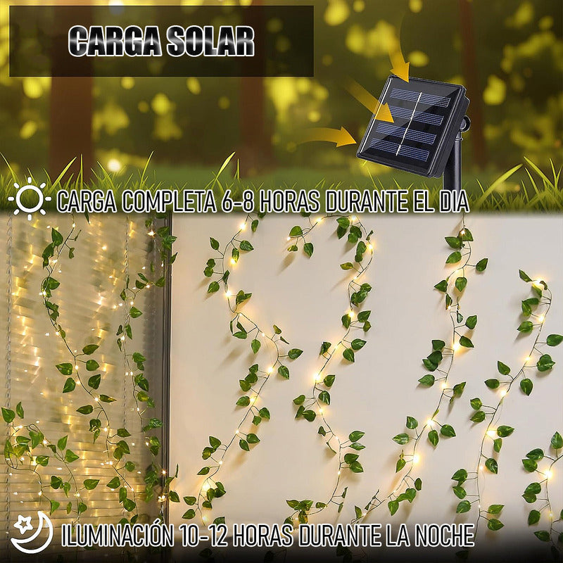DESCRIPCION DEL PRODUCTO LUCES DE NAVIDAD SOLARES Luces de vid preenrolladas y encanto instantáneo: no se necesita bobinado - desempaqueta y drapea! La hoja de hiedra/potos pretrenzado con LED cálidos llega lista para colgar. Dobla el alambre de cobre flexible en arcos, corazones o cascadas en segundos. Ahorra un 90% de tiempo de configuración en comparación con las luces de cadena tradicionales. Solar Auto Magic y dureza para todo tipo de clima: sensor de luz integrado, las luces se encienden al anochecer y se apagan al amanecer. El panel solar monocristalino se carga en 6 horas (10-12 horas de tiempo de funcionamiento). Con clasificación de impermeabilidad IP44, esta guirnalda de primavera con luces se adapta a todas las áreas al aire libre. 8 modos de iluminación para cada estado de ánimo y escena: ¡desde la serenidad del jardín hasta el brillo de la fiesta! Cambia entre brillo constante, centelleo, desvanecimiento y 5 modos más a través del botón. Ideal para patios durante todo el año, detalles de vegetación navideña o fondos rústicos de boda. Diseño realista y decoración estética: enredaderas de imitación tan reales, incluso los pájaros se posarán. Las enredaderas realistas en forma de hiedra/Pothos crean encantadoras sombras naturales, combinándose perfectamente con la vegetación al aire libre. CONTENIDO DE LA COMPRA X1 LUCES DE NAVIDAD SOLARES