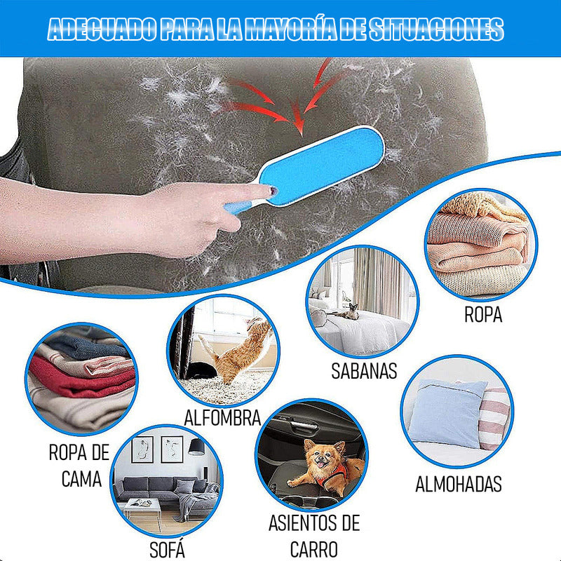 DESCRIPCION DEL PRODUCTO CEPILLO QUITA PELUSA MASCOTA Este es un cepillo removedor de pelo de nueva generación con pelusa de doble cara en el interior con base autolimpiante, nuestro cepillo proporciona más de un pincel de pelusa de una sola cara, simplemente voltee el lado de la paleta que necesita, lo que hace que la limpieza sea más rápida, más conveniente que el viejo removedor de cabello de un solo lado. Siga la dirección de las cerdas cuando cepille. Luego sumerja el pincel en la base de autolimpieza y extráigalo para eliminar la acumulación de pelusa del pincel. Para su comodidad, un cepillo de tamaño de viaje, así que esté incluido en el paquete. Es un tamaño de bolsillo y con poco peso. Puedes sacar este equipo de tu ropa. Organizado en conjunto con el guante de limpieza, este cepillo de pelo no solo sirve para actividades en los espacios interiores, sino también para los exteriores, como muebles tapizados, ropa, alfombras, pijamas, camas, almohadas, zapatos y todo tipo de asientos de coche. Fabricado con el material duradero HIPS y Soft Fluff, este cepillo extraíble es bastante duradero y reutilizable, además respetuoso del medio ambiente. Es fácil de extraer el pelo caído de la mascota en todas partes del cuerpo. El cepillo es direccional, resulta con más eficacia utilizarlo en la dirección opuesta, contra el grano. CONTENIDO DE LA COMPRA X1 CEPILLO QUITA PELUSA MASCOTA