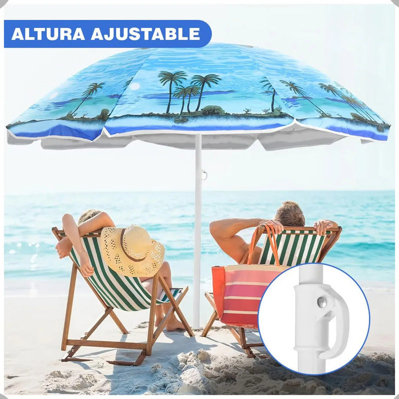 DESCRIPCION DEL PRODUCTO Sombrilla Quita Sol de Playa De 150 cm Esta amplia sombrilla para playa proporciona 150 cm de fresco, relajante sombra y protección UV. La funda está fabricada con poliéster resistente, resistente al agua, y la barra de plástico ABS ligero Y Aluminio. Libremente ajustar la altura de su paraguas hasta 170 cm para amoldarse a la posición del sol. También incluye palanca de bloqueo y desbloqueo de su posición es tan simple de bajar y subir. - - Diámetro: 150 cm - - Altura Maxime: 180 cm - - Color: Multicolor - - Material: Poliéster, ABS y Aluminio - - Ideal para playa o cualquier actividad en verano y primavera. ___________________________________________________ CONTENIDO DE LA COMPRA X1 Sombrilla Quita Sol de Playa De 150 cm