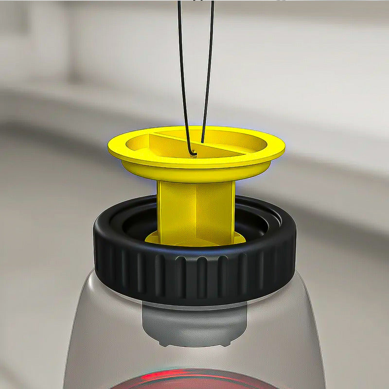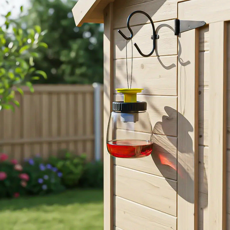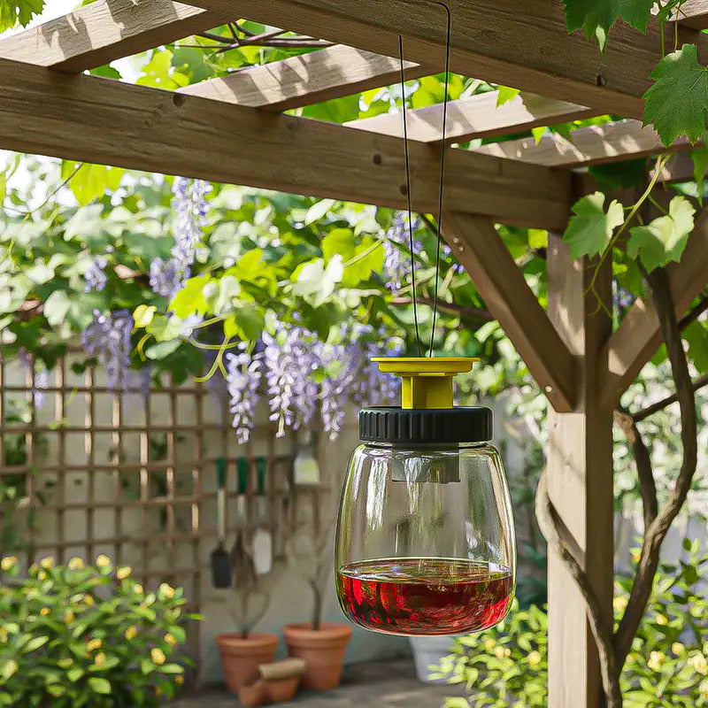 DESCRIPCION DEL PRODUCTO TRAMPA PARA AVISPAS Gracias a su diseño único, permite atrapar simultáneamente muchos insectos que se acercan desde diferentes direcciones gracias a los numerosos orificios de la tapa. Una vez dentro de la trampa, las avispas no tienen escapatoria, y la alta temperatura interior elimina rápidamente a los insectos. No contiene sustancias tóxicas, lo que lo hace completamente seguro tanto para humanos como para mascotas. Es una alternativa eficaz y ecológica a los insecticidas químicos. Es una solución práctica y estética que se adapta a cualquier espacio. Su diseño minimalista la convierte en el complemento perfecto. Puede ser un atractivo complemento para su jardín, pero también una solución práctica para un huerto o granja, combinando eficacia, estética y seguridad. Reutilizable: económico y ecológico. Fácil de limpiar: mantenimiento sencillo y vaciado cómodo Sin sustancias tóxicas: una alternativa segura a los insecticidas químicos Atrapa y no suelta insectos: confiable en la lucha contra las avispas Seguro para personas y mascotas: no representa una amenaza para su familia o mascotas. Cómo utilizar la trampa para avispas 1. Desenrosque la tapa superior y vierta el cebo líquido en la botella trampa. 2. Atornille la tapa superior para asegurar el contenido. 3. Cuelgue la trampa usando la cuerda incluida en un lugar alejado de las personas. 4. Una vez que la trampa esté llena de avispas, vacíe el contenido en la basura municipal y vuelva a llenarla con el atrayente líquido. CONTENIDO DE LA COMPRA X1 TRAMPA PARA AVISPAS