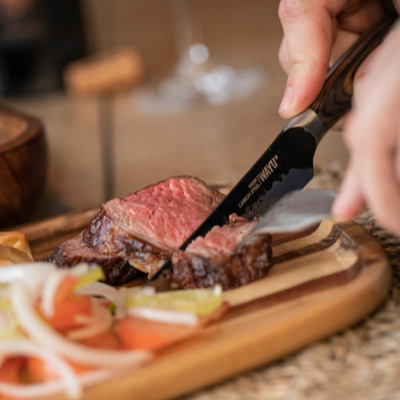 Material Hoja: Acero Inoxidable Mango: Madera Pakka Hoja: 12,7 cm x 2 mm Set de cuchillos confeccionados con acero inoxidable y mango de madera Pakka, ideales para la cocina. Destacan por su calidad y estética. Wayu es una marca que selecciona cuidadosamente sus materiales y detalles, proporcionando un toque especial y distintivo. Busca ser esencial para comidas diarias y eventos destacados. Utensilios óptimos para cada ocasión.
