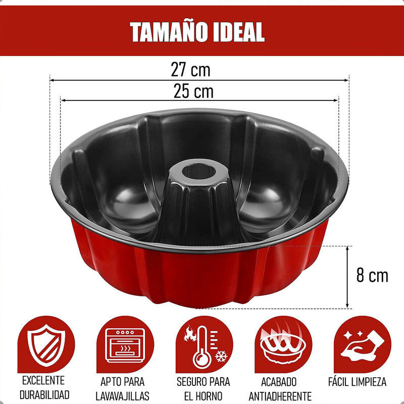 DESCRIPCION DEL PRODUCTO MOLDE PARA TORTA Increíble molde de queque buena calidad, ideal para todos esas recetas deliciosas que se te puedan ocurrir! El molde para pasteles tiene un diseño continental con forma redonda, un tubo profundo en el medio y una superficie arremolinada. El revestimiento antiadherente le permite quitar fácilmente los productos horneados del molde. Estas sartenes son un complemento perfecto para su cocina para preparar el mejor postre para su familia y amigos. Chapa de acero con revestimiento antiadherente reforzado. Resistente al calor hasta 260 °C y fácil de limpiar a mano. CARACTERISTICAS DEL PRODCUTO: - Medidas: 27X8 CM - Material: Teflón - Altura: 8cm - Antiadherente SOMOS OKSHOP