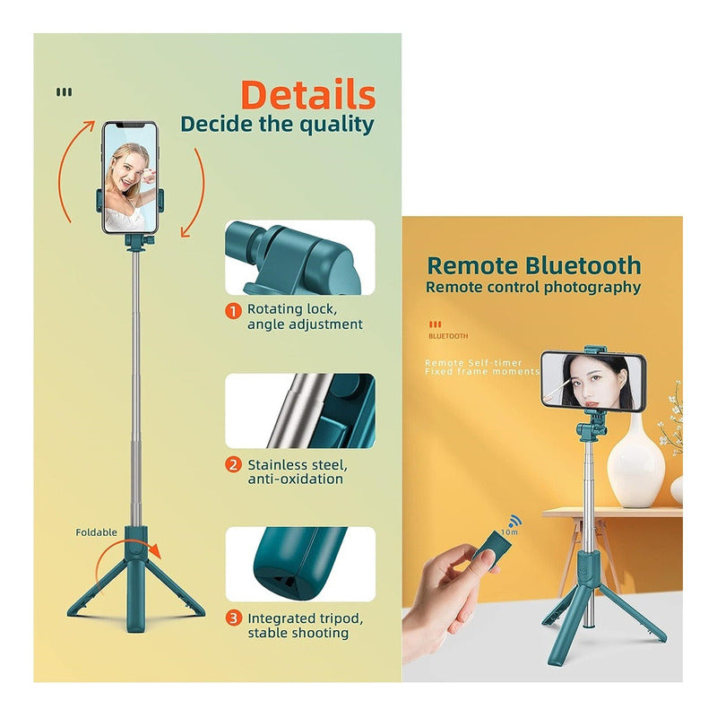 DESCRIPCION DEL PRODUCTO MUÑEQUERA CALENTADORA TRIPODE PARA CELULAR, PALO SELFIE EXTENSIBLE Trípode para selfie con mando a distancia inalámbrico, el palo selfie 3-1 con control remoto inalámbrico integrado, es fácil de tomar selfie-fotografía o fotos de grupo, adecuado para fiestas, viajes, senderismo, etc. También se puede utilizar como un trípode rápido y fácil. Soporte extensible y plegable para teléfono, diseño compacto y ligero. Es portátil para llevar a todas partes, como viajes, deportes al aire libre, grabar diferentes momentos maravillosos para ti. Ángulo ajustable y soporte portátil para teléfono Palo selfie ampliamente compatible con la mayoría de teléfonos inteligentes en el mercado, como iPhone 11/11 Pro/11 Pro Max/XS Max/XS/XR/X/8 Plus/8/7Plus/7/6Plus/6, Samsung Galaxy S10/S9/S8/S7/Note10/8 y más. Fácil de usar, se puede utilizar en sólo tres pasos. Solo tienes que pulsar para encenderlo, emparejarlo con el teléfono inteligente a través de Bluetooth. Póngase en contacto con nosotros libremente si cualquier problema, le ofreceremos la solución adecuada para usted en la primera vez. CONTENIDO DE LA COMPRA X1 TRIPODE PARA CELULAR, PALO SELFIE EXTENSIBLE